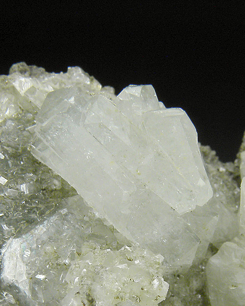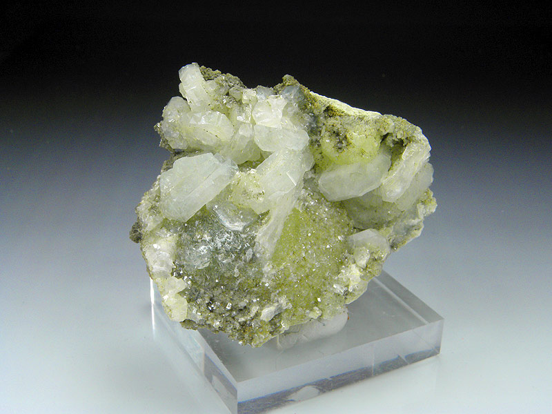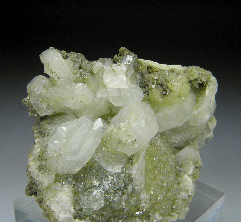 White pearly Apophillite cystals, all well shaped, up to 2,0 cm wide with green prehnite and laumontite in association.