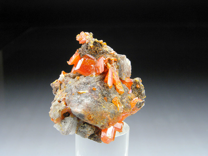 Cluster of Wulfenite tabular xls up to 8 mm with red-orange color nicely scattered on matrix