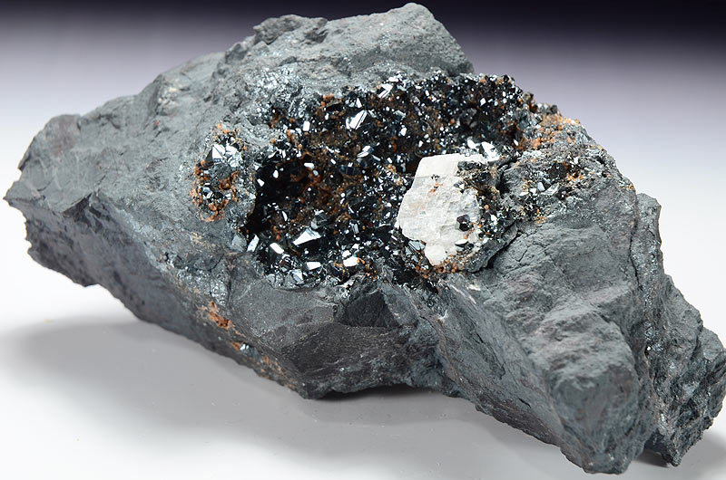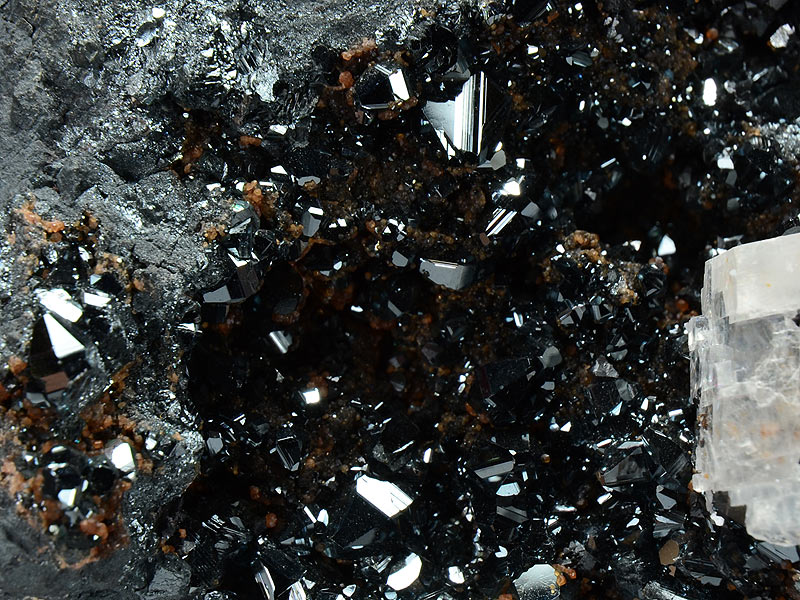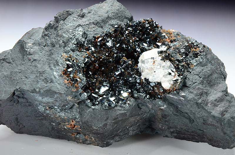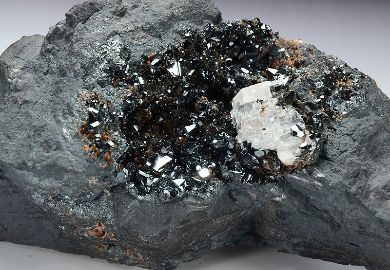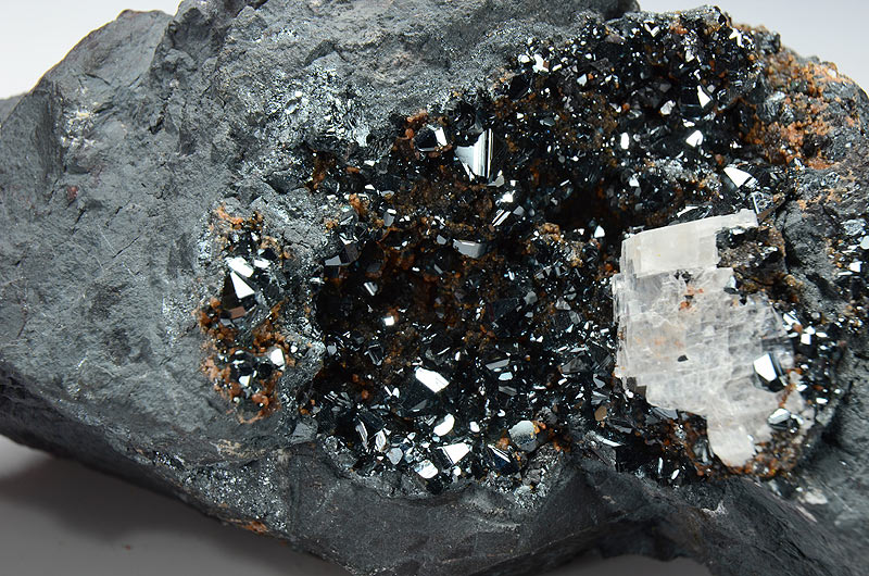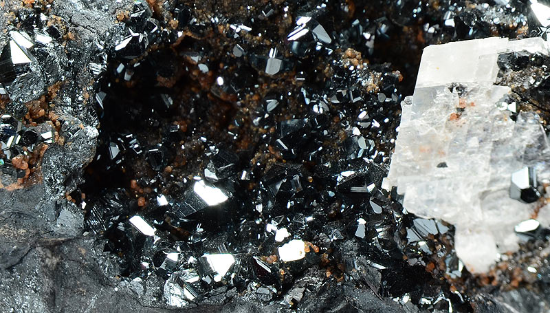 Cabinet specimen rich of sharp, brilliant hematite crystals up to 6-7 mm scattered in a vug of manganese matrix with calcite in association.Showy.
