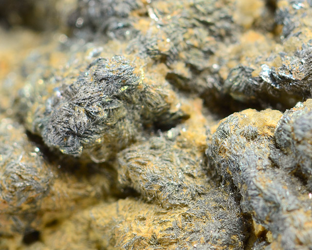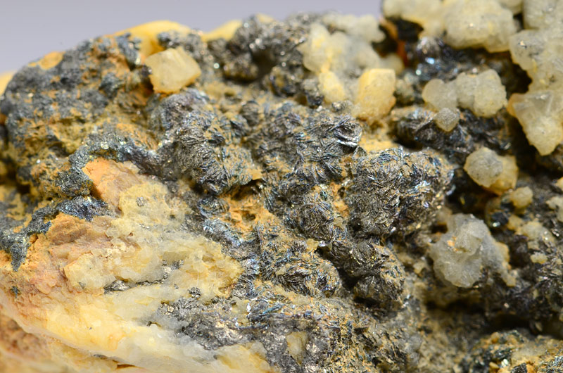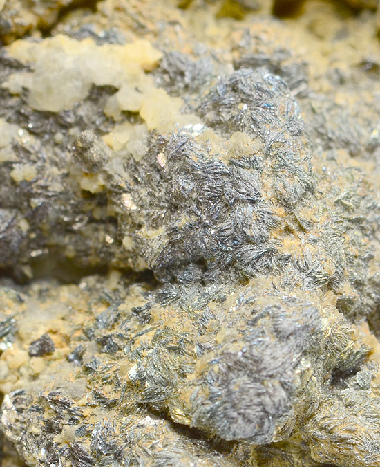 Cluster of grey metallic Lollingite crystals in grouped blades up to 1-2 mm wide on dolomitic calcare.