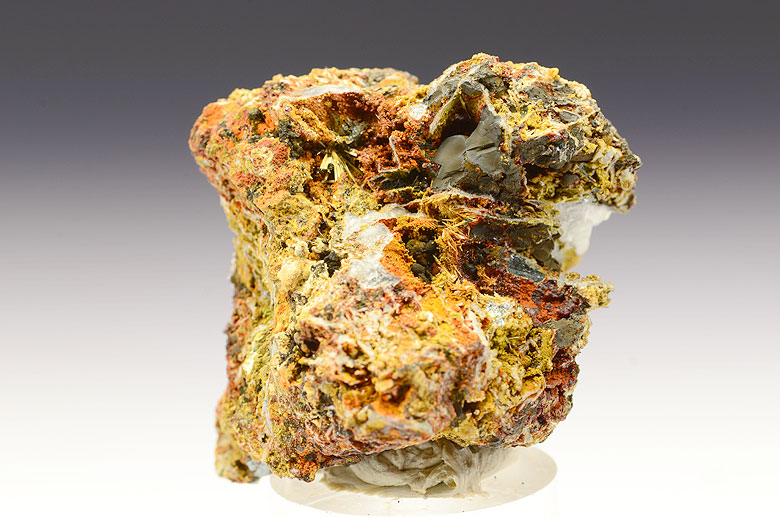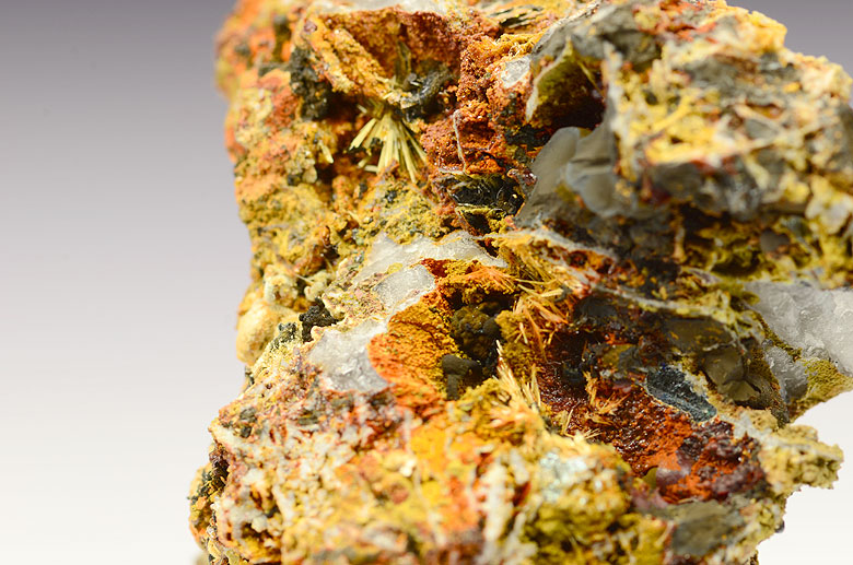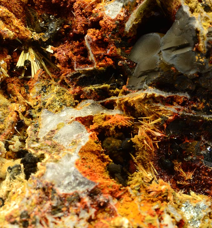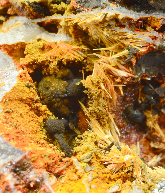 Specimen with Strunzite in yellowish sericeus acicular xls up to 3 mm scattered on matrix with Beraunite and Rockbridgeite in association from the type locality.