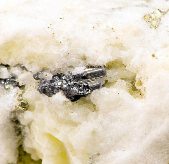 Metallic, steel-gray Baumhauerite xls 3 mm wie in a vug of White contrasting dolomia matrix from the famous Swiss and type locality.