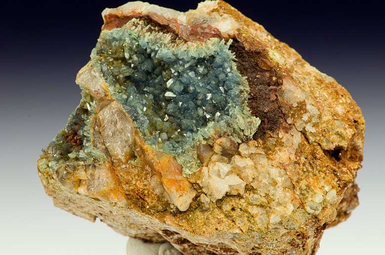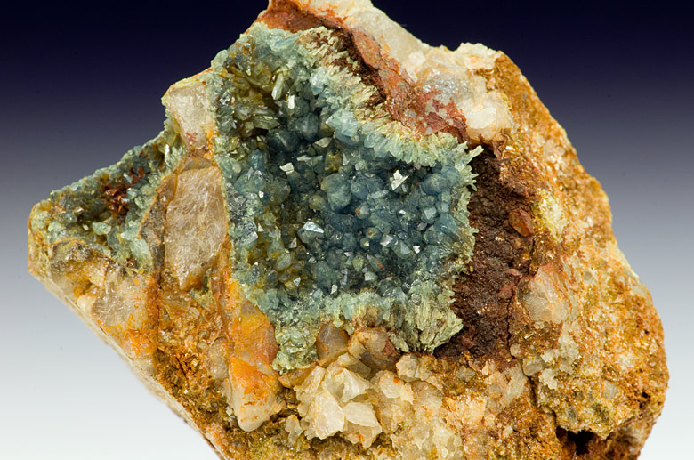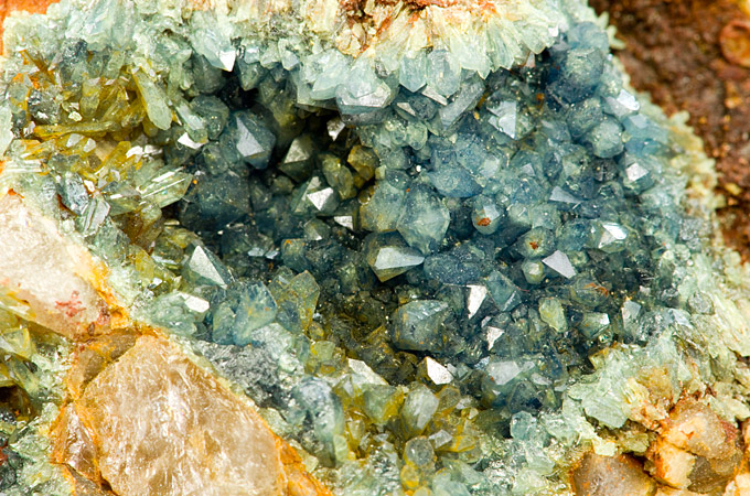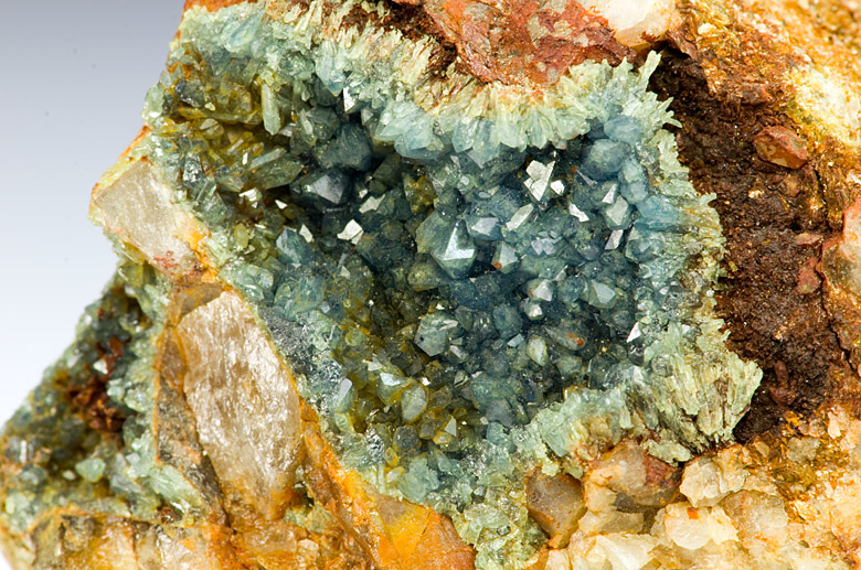 Very nice cluster of bright bluish Scorodite xls up to 3 mm tall in vugs of quartz matrix from the classic british locality of Hemerdon Bal. Rare and classic!!