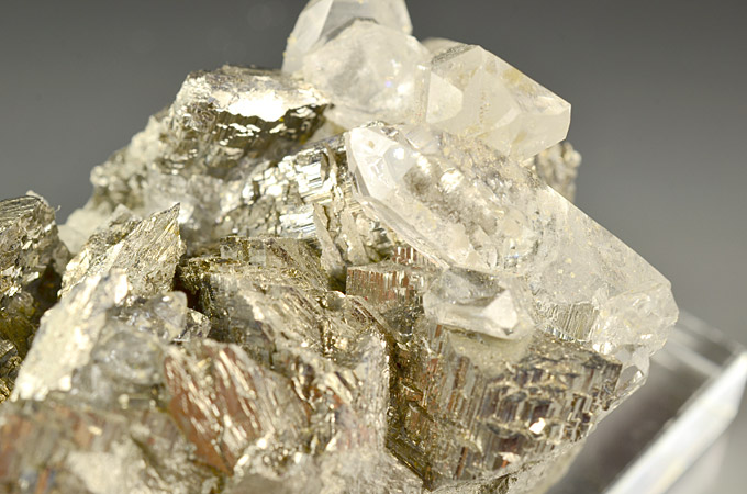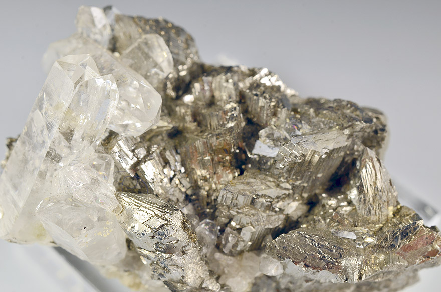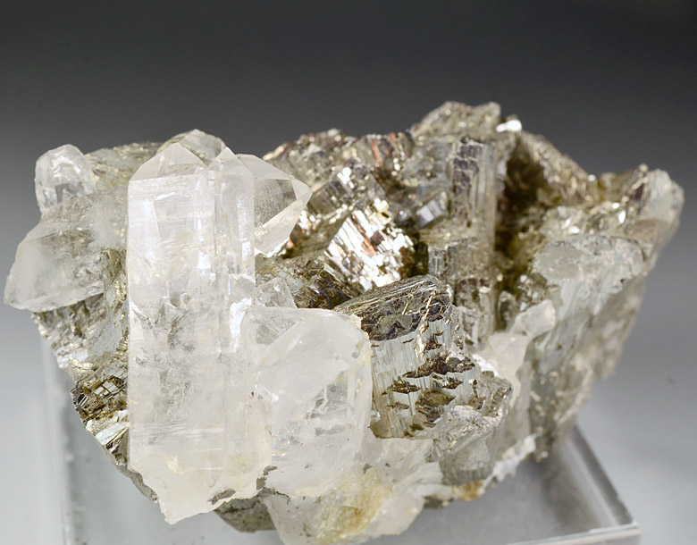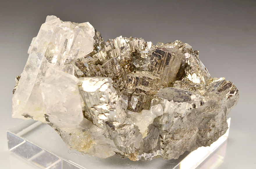 Cluster of silver grey, very lustruous xls of Arsenopyrite up to 2,5 cm tall with clear xls Quartz in association.Showy.