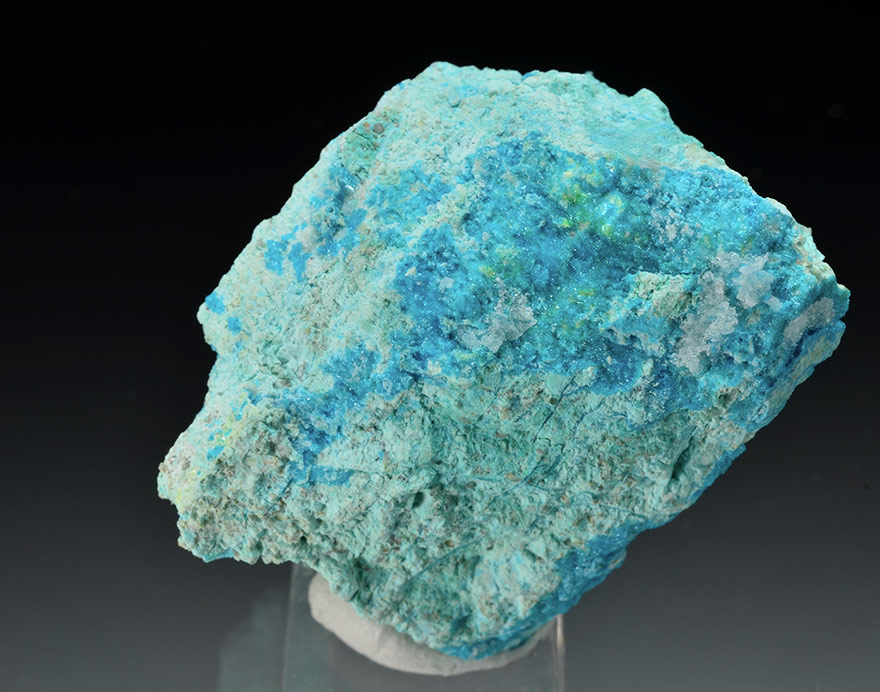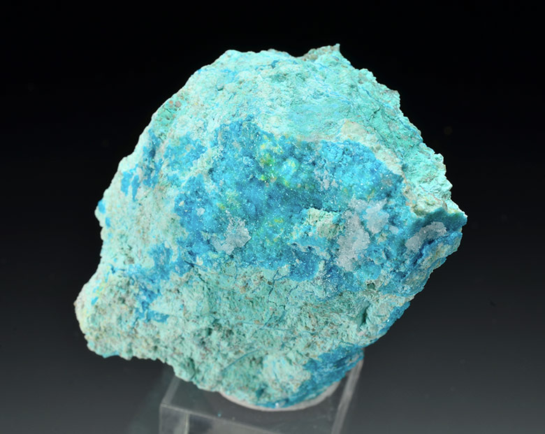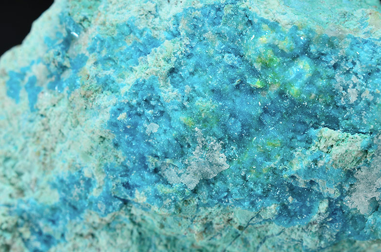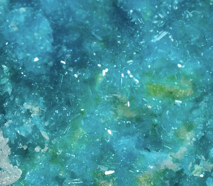 A rarely seen specimen of bright greenish-blue caledonite with minor chlorargyrite on matrix from this small abandoned Cu-Pb mine not far from the old Cerros Pintados outcrops. it looks great under the microscope.