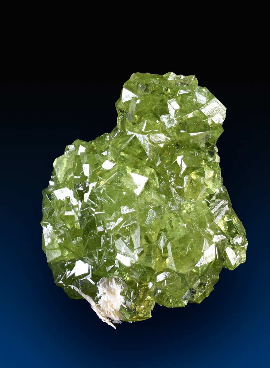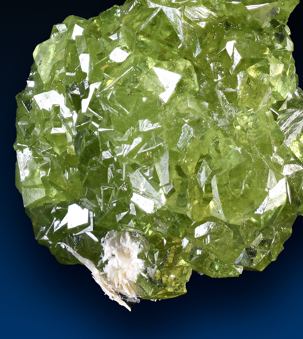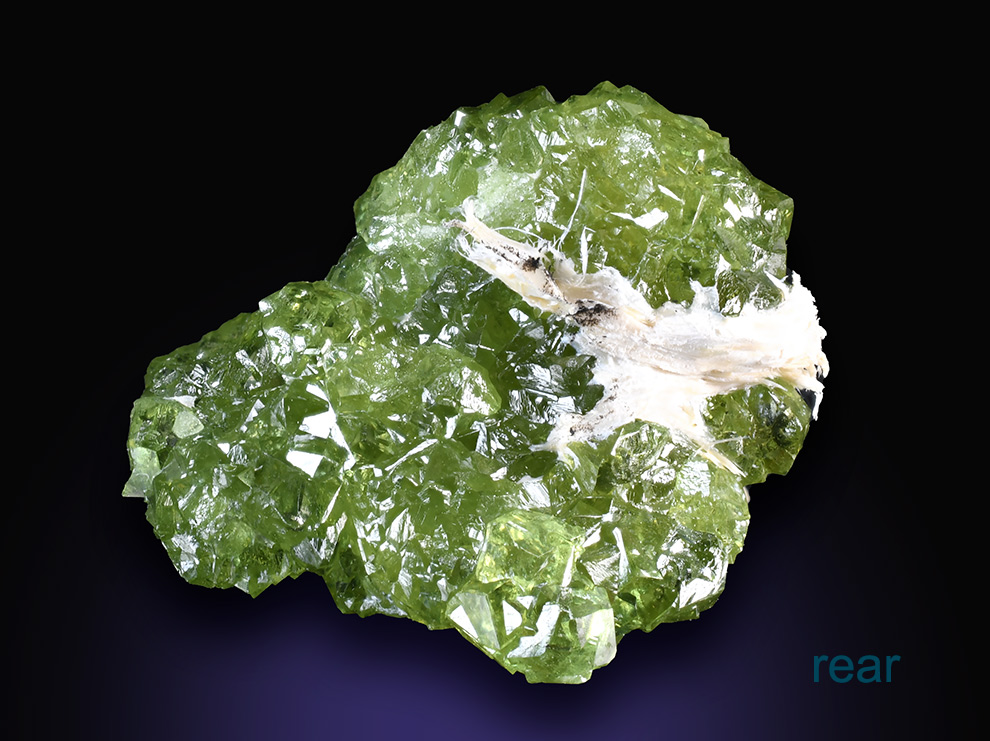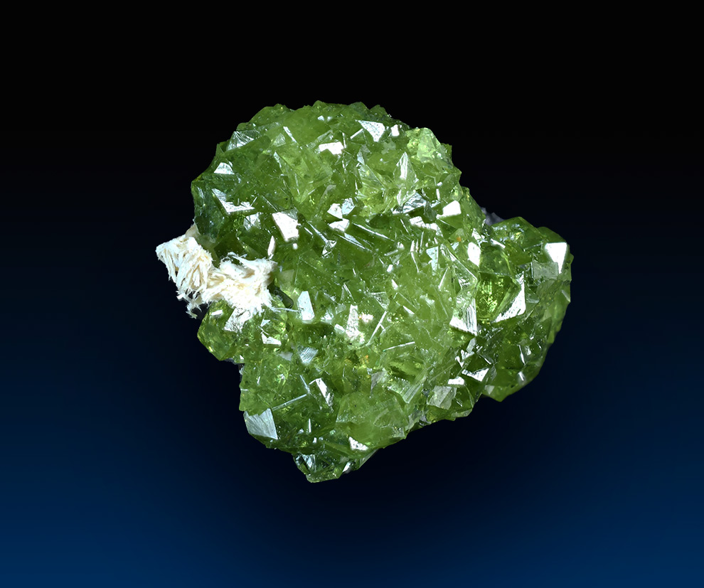 Cluster featuring lots of sharp rombododecahedra of Demantoide with bright green color, good shape, and excellent luster.Minor fibrous Asbestos i association. Really showy thumb specimen from an old find.