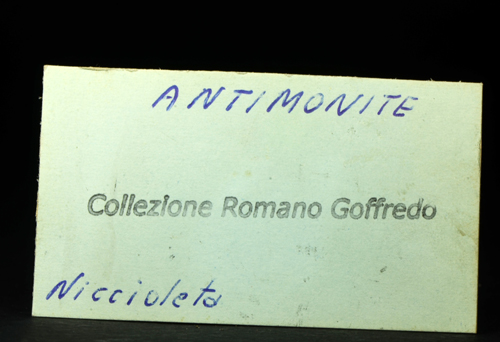 Spray of elongated gray Stibine xls, well terminated. Oldtimer from an italian mine exploited for Pyrite, sadly closed since decades now. Not at the level of the famous chinese or japanese specimens, but interesting for the italian topology. Former R. Goffredo collection, with label.