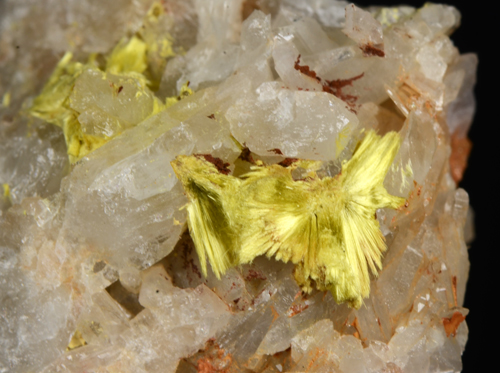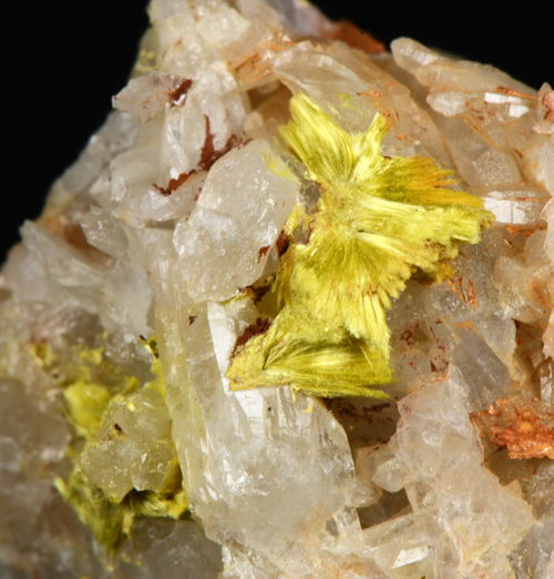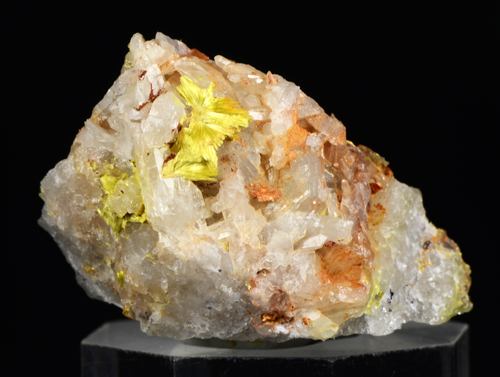 A specimen of quartz with a vug which has originated a nice coverage of yellow tuffs of Ferrymolibdite. A rare italian classic, very well represented! Former collection Sandro Maggia, with label.