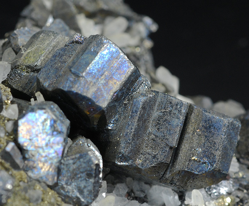 A big 'cogwheel' shaped, dark grey colored crystal of bournonite is in good evidence over the surface of this specimen. Some other minors are visible all around. Some colorless crystals of quartz and goldish crystals of pyrite are spread somewhere.