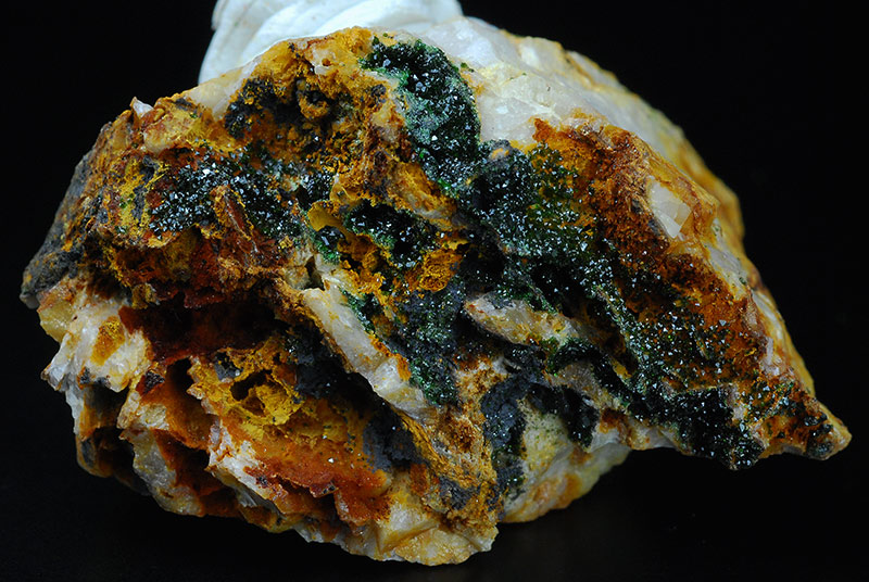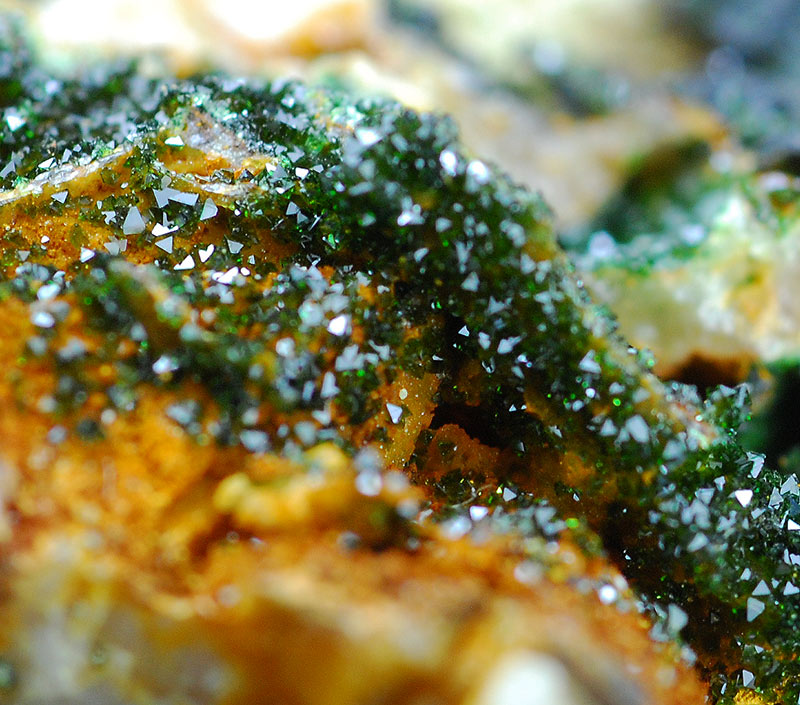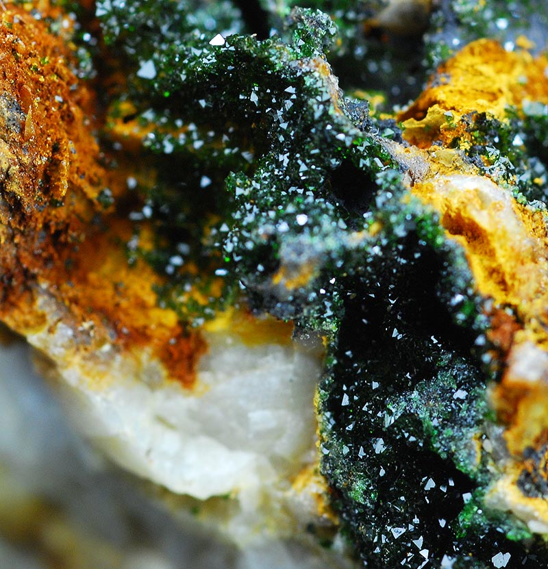 A specimen where several little, brilliant, green dark colored crystals of Liebethenite are in strong contrast with the whitish matrix. The pictures are a little overligthened to show the details, the real color is darker.