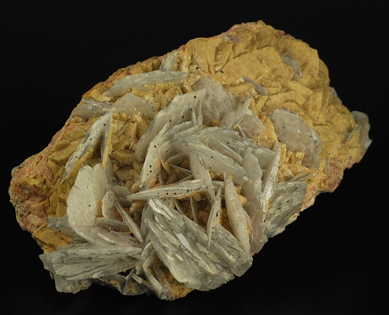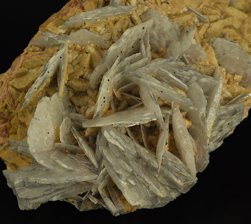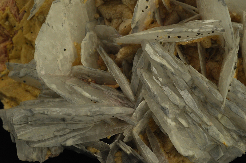 The cluster is covered by pink rhodochrosite: some blades, pale grey-blue colored barytes are grown over it.