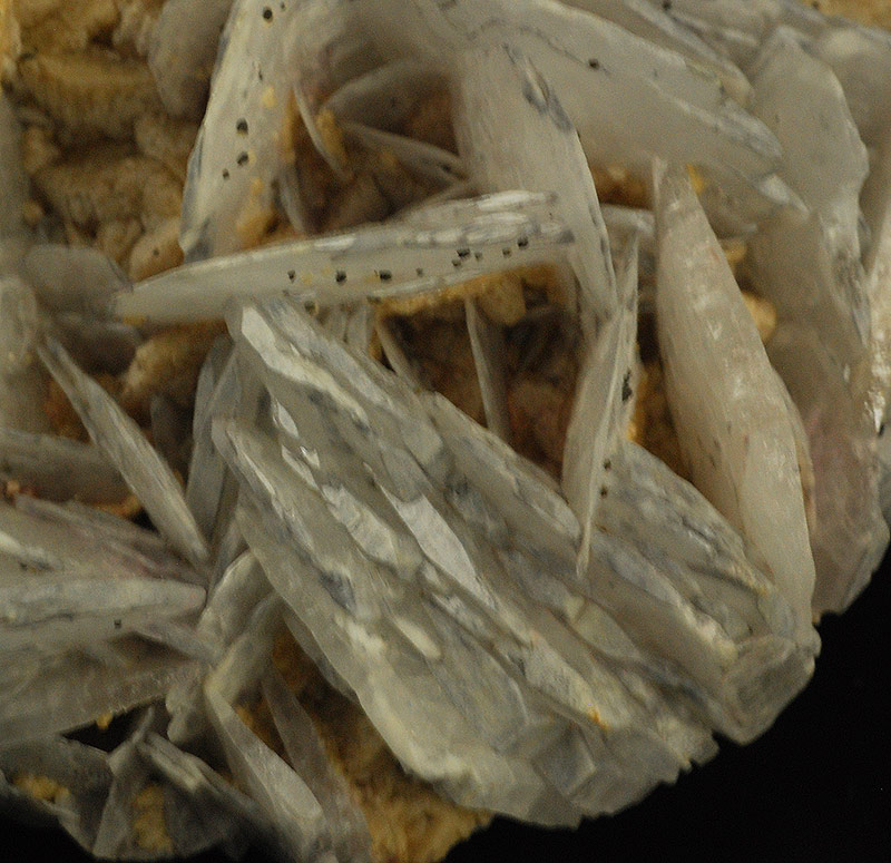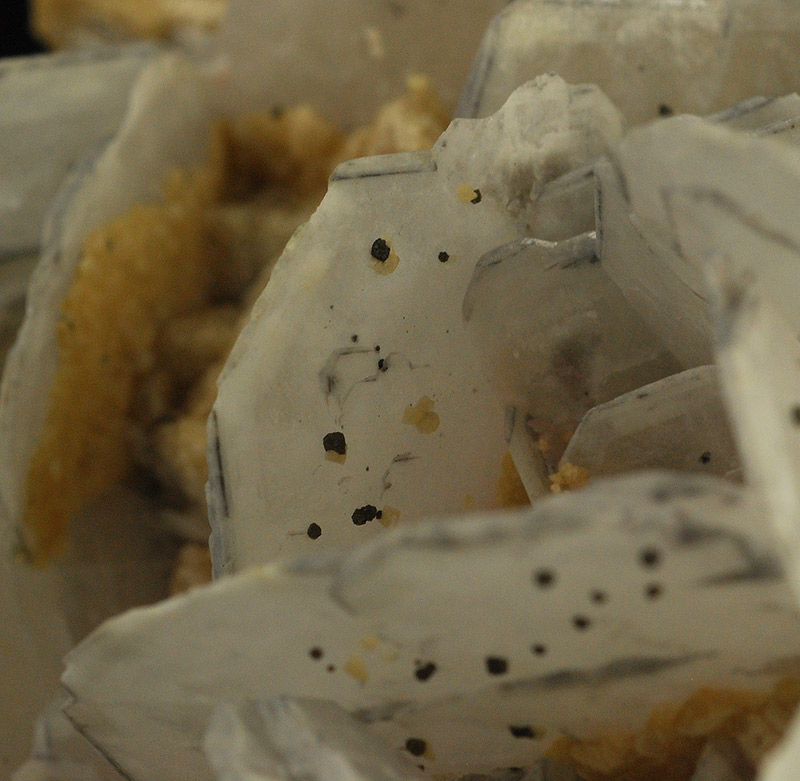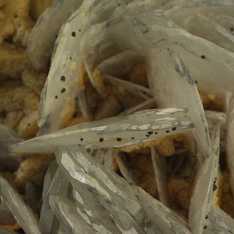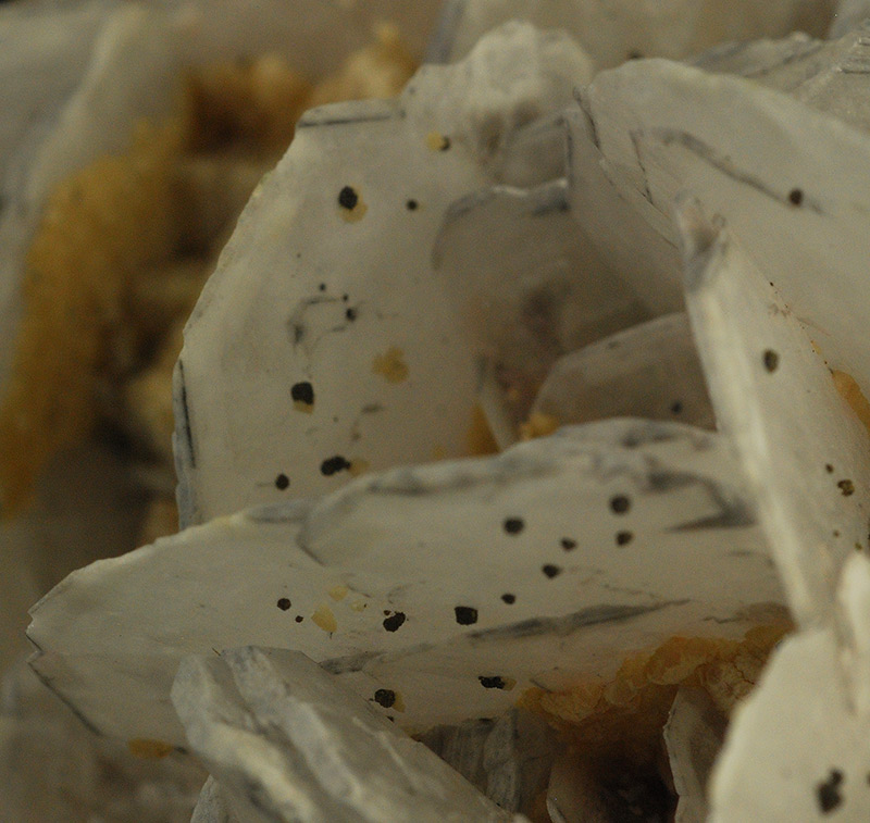 Some of them are encrusted by yellow-brown carbonate, some others have several black minidots, probably of goethite.