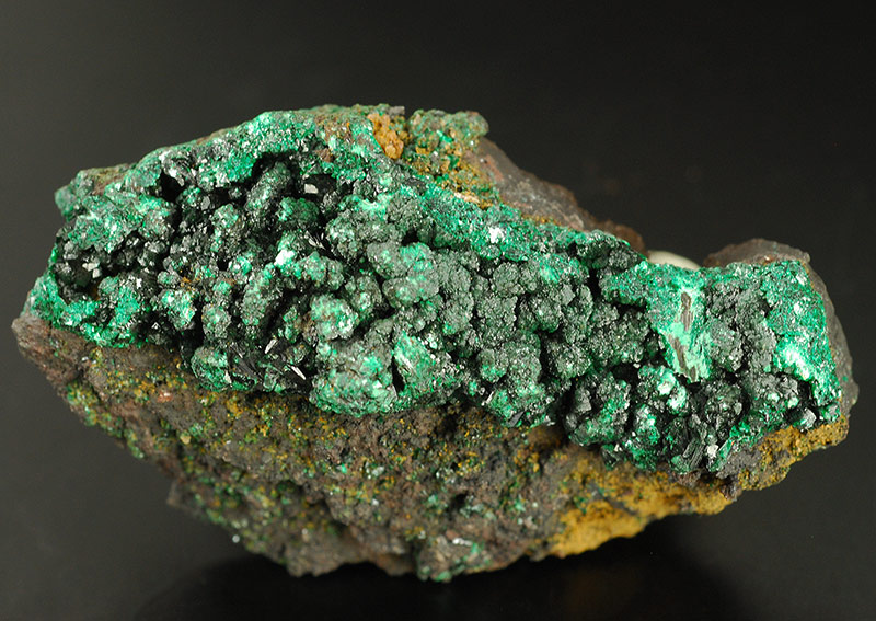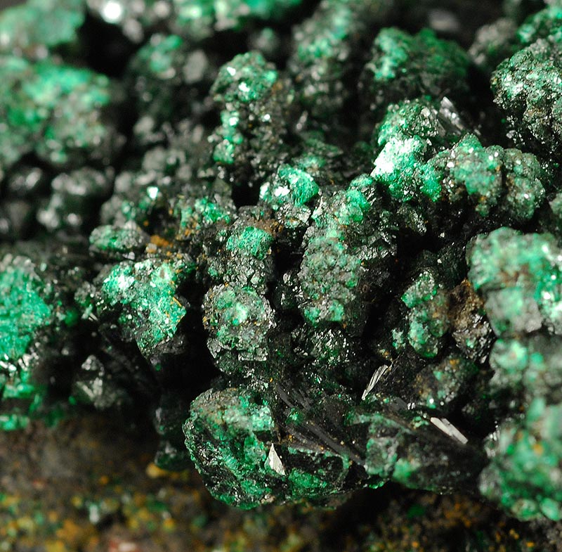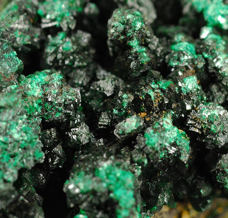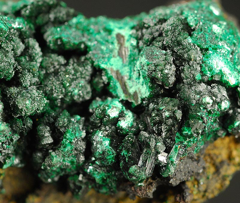 The surface of this specimen is covered by several brilliant and dark black crystals of heterogenite. They are in strong contrast with the green of the malachite. The picctures are a little overlightened to show the details.