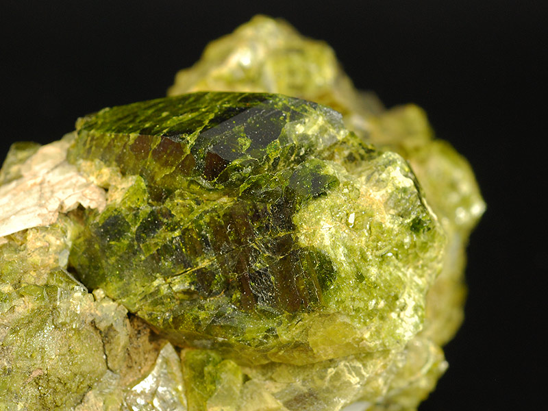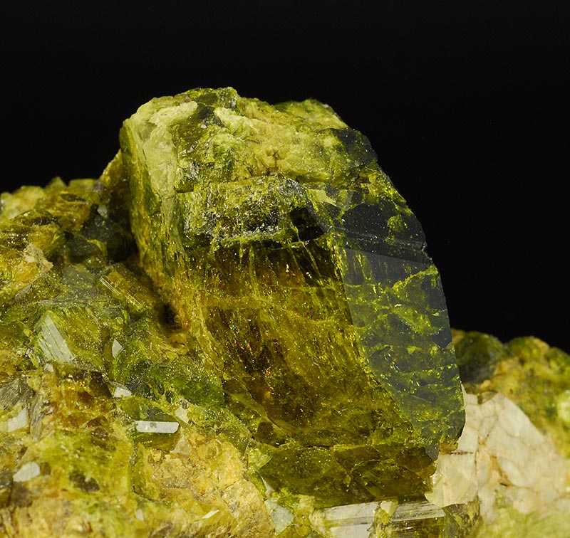 A big, brilliant and dark green colored crystal of epidote is stunning over the matrix. It's not perfectly terminated 'cause it was in contact in its upper top. Some other minor crystals are visible too. From a found of almost 30 years ago.