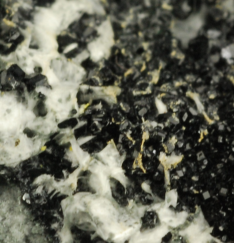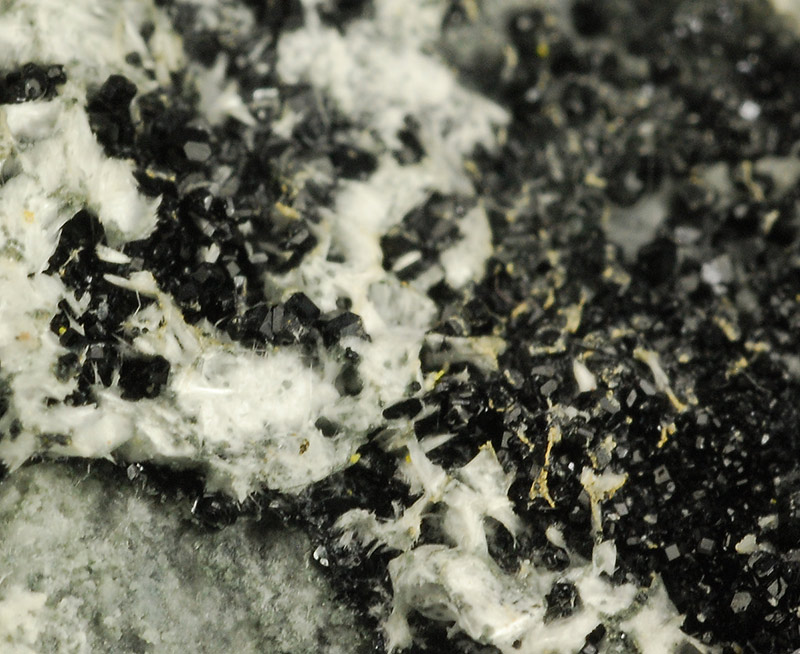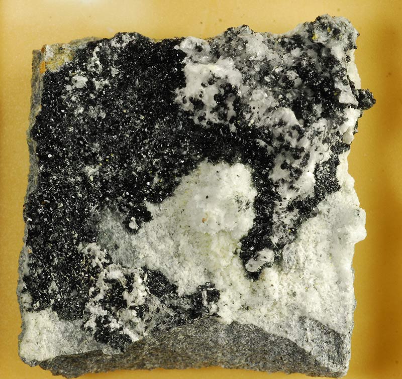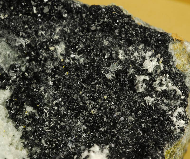 The surface of this specimen is covered by black and brilliant cristals of Voltaite, that is an uncommon sulphate of K + Fe + Al. Some white areas of pickeringite are visible and gives an evident contrast. The item is glued to the plastic bottom.