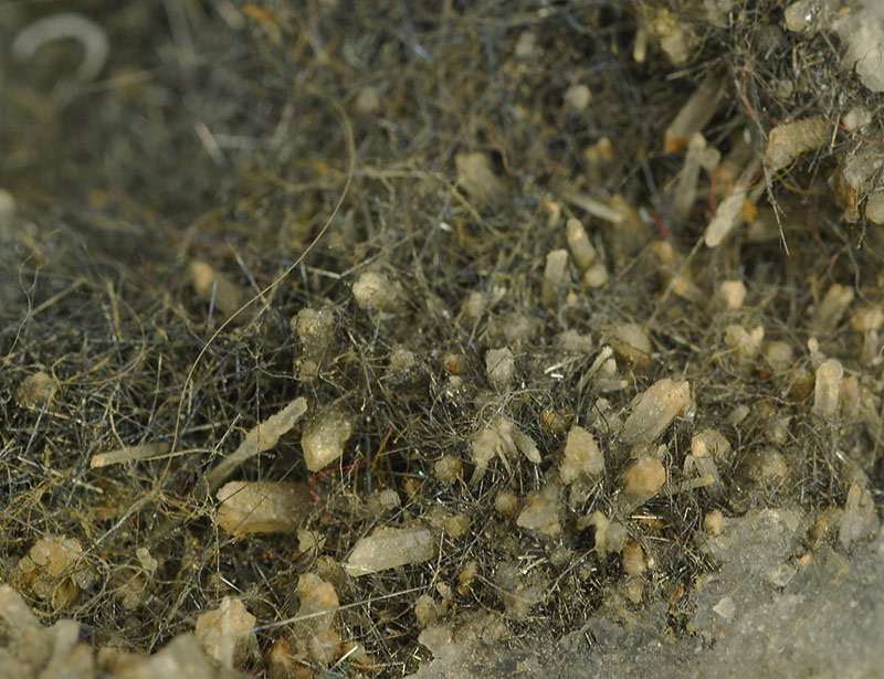 A myriad of long grey needles of boulangerite are arranged over some crystal of quartz. They seems aggregated in the chaos. Typical from this tuscan mine.