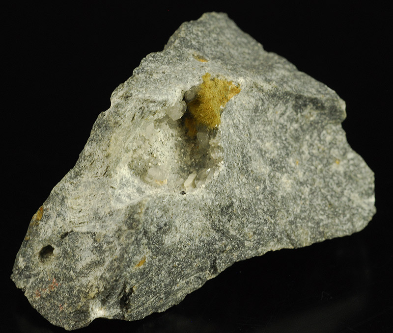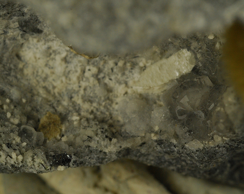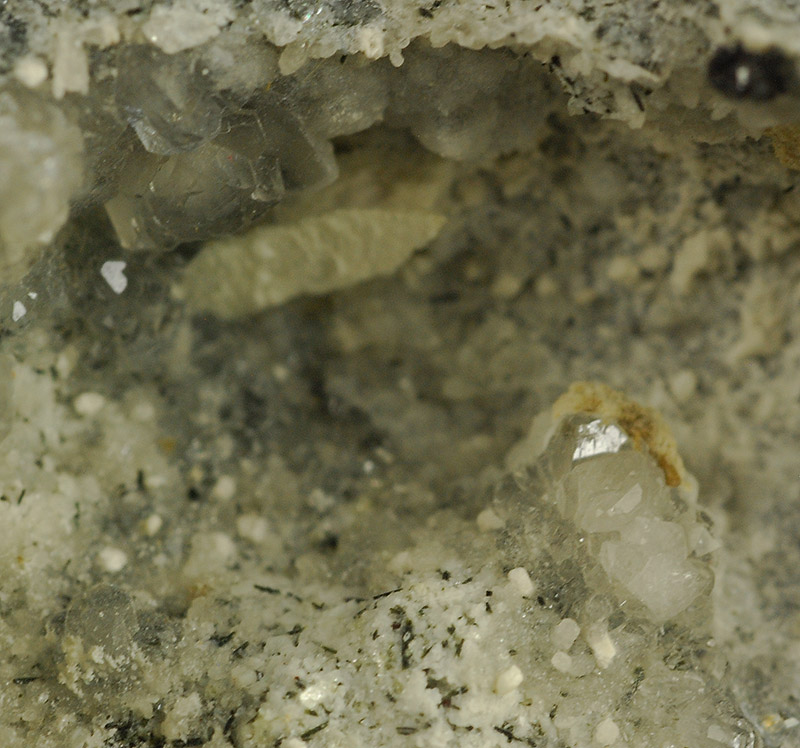 A little, brown colored crystal of bastnaesite (3 mm.) is featuring on and edge of the vug of this specimen: this species is a rarity for this locality. In a corner of the vug ther is a fibrous terminated crystal of tuperssiatsuaite (10 mm.). Inside the vug there are some transparent crystals of apophyllite and some white of makatite.