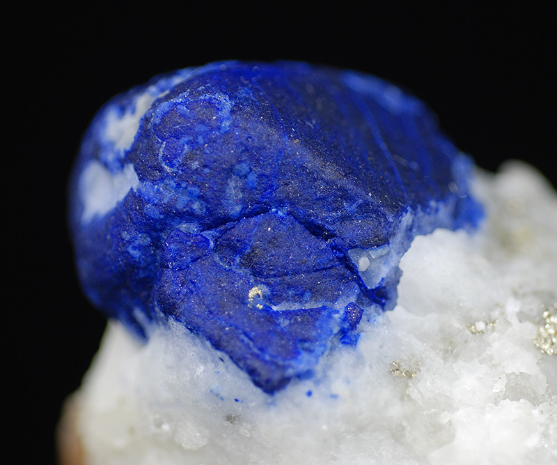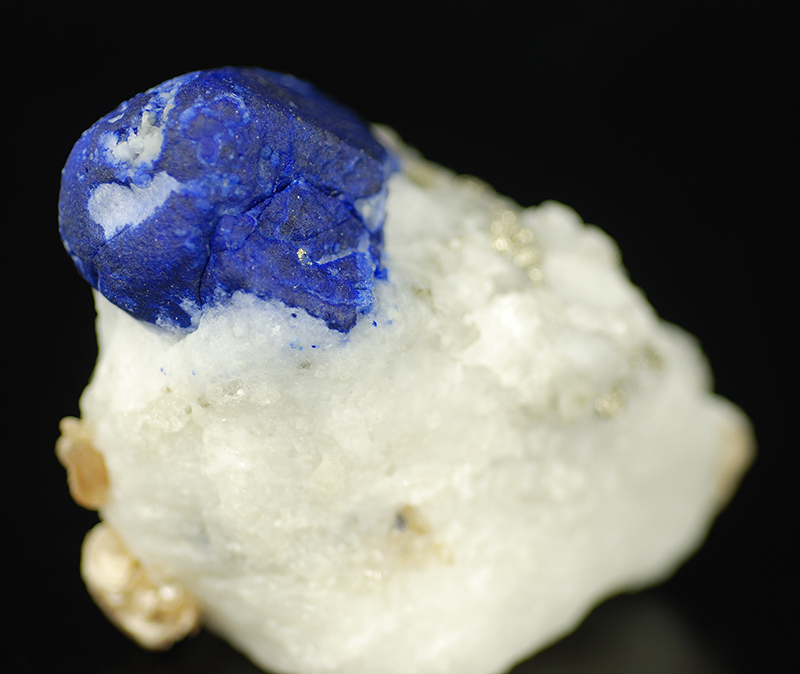 A big, dark blue colored crystal of lazurite is scattered out the whitish matrix of marble. Some areas of it have an electric blue color. Ther are some little, golden colored crystals of pyrite and some others of chondrodite that are pale brown colored.