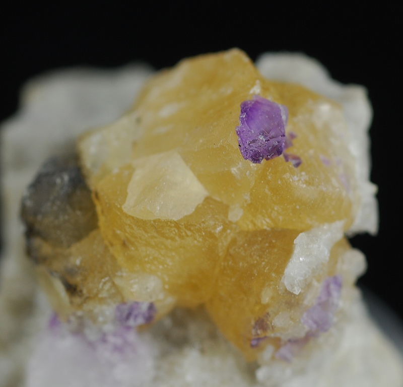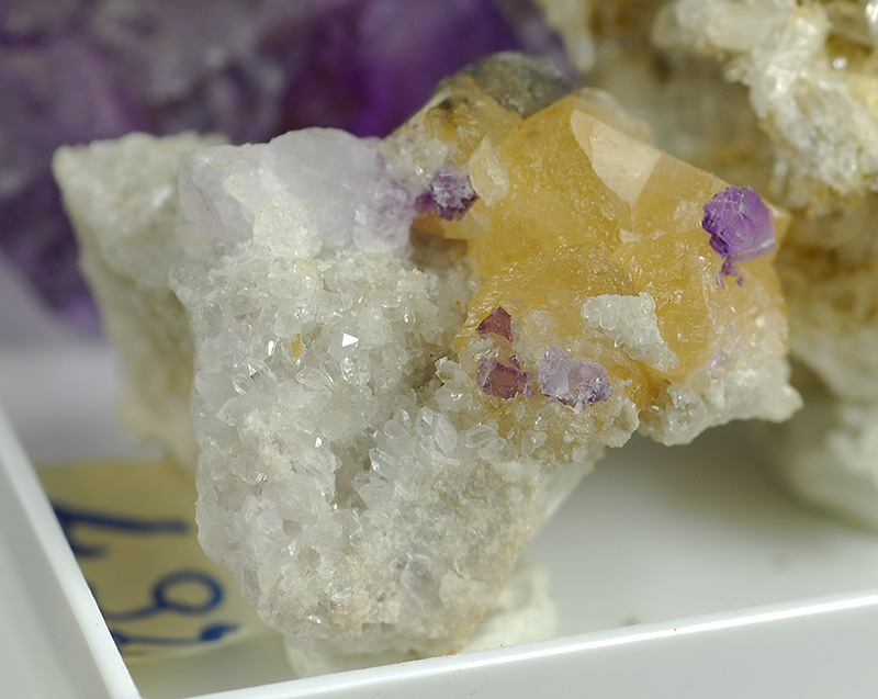 Three specimens from this famous alpine italian mine: - a cube of violet fluorite with internal 'ghost' (mm. 30 x 27 x 23) - orange calcite over quartz, with some little violet cubes of fluorite over it (mm. 27 x 18 x 26) - hyalin quartzes (mm. 45 x 36 x 32)