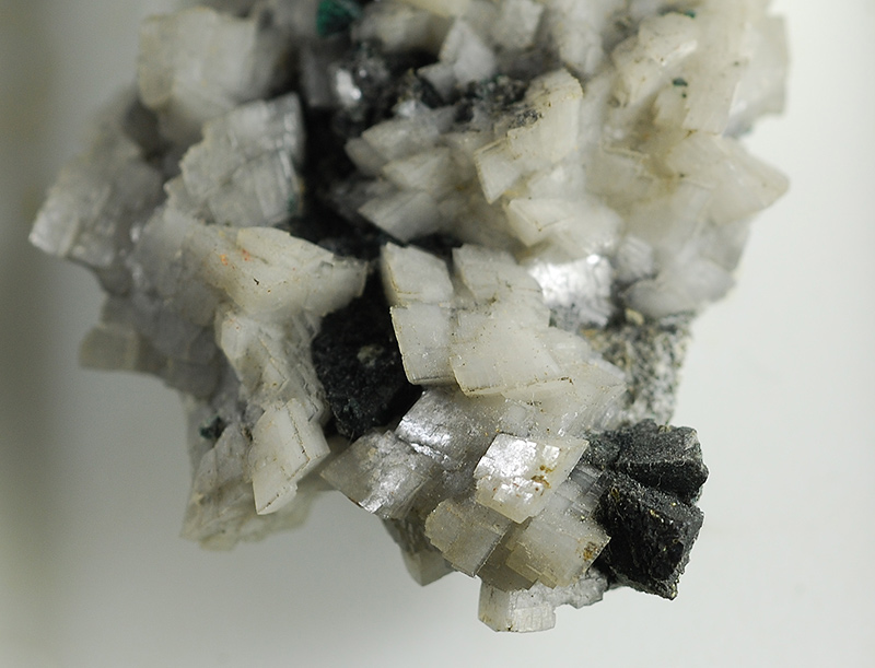 Some dark grey crystals of chalcocite are stunning over the matrix that is covered by greyish crystals of calcite.