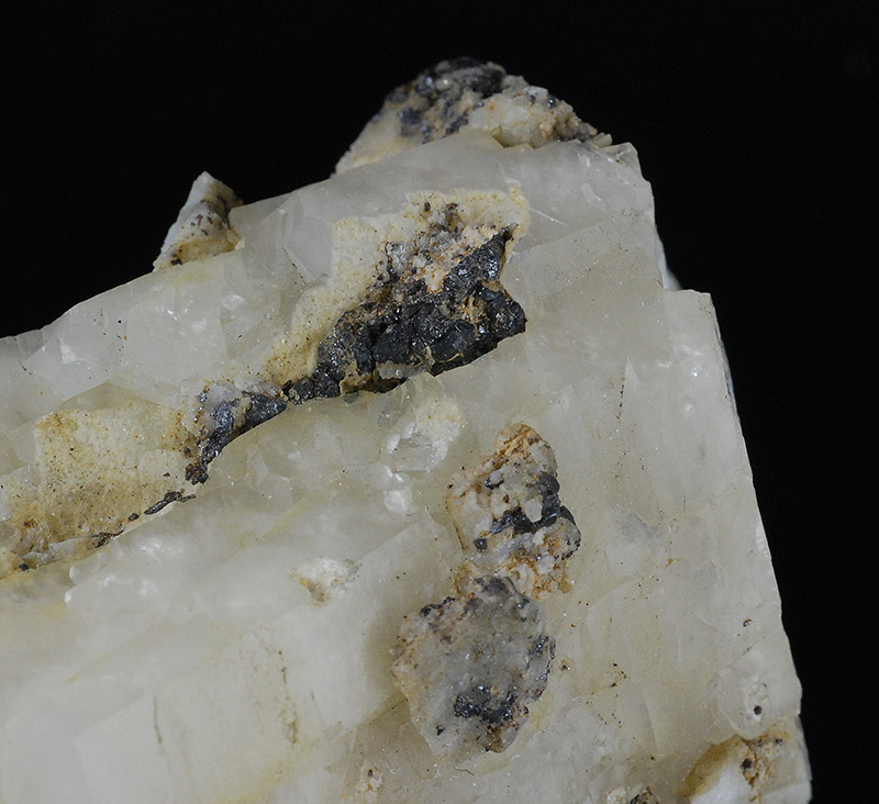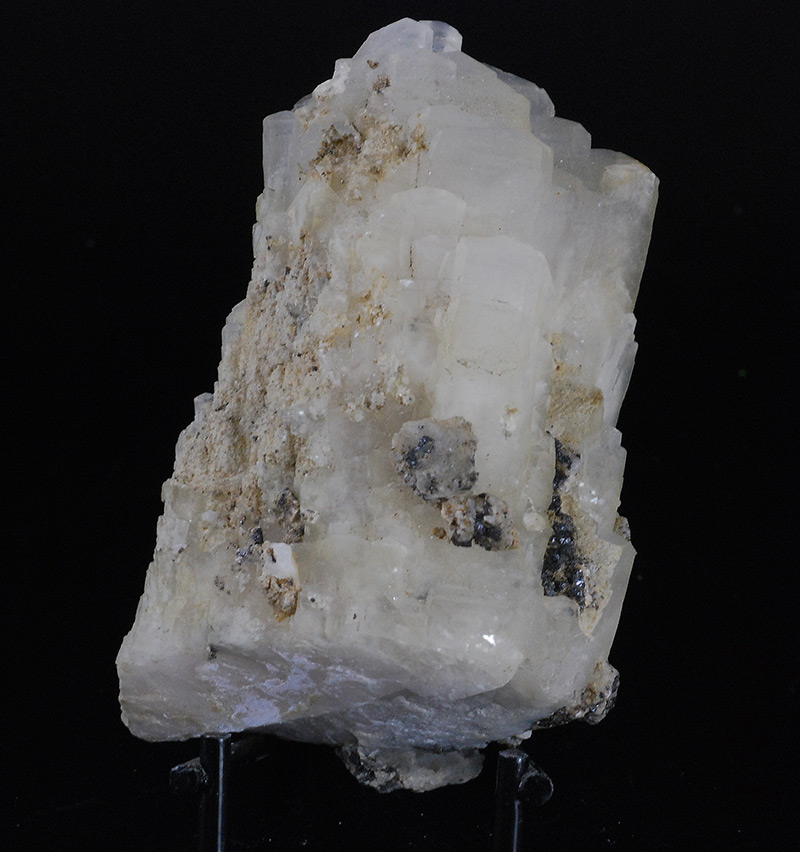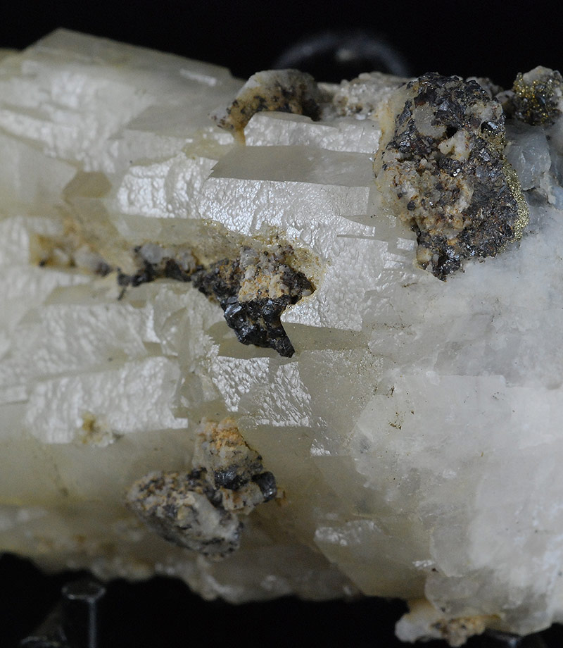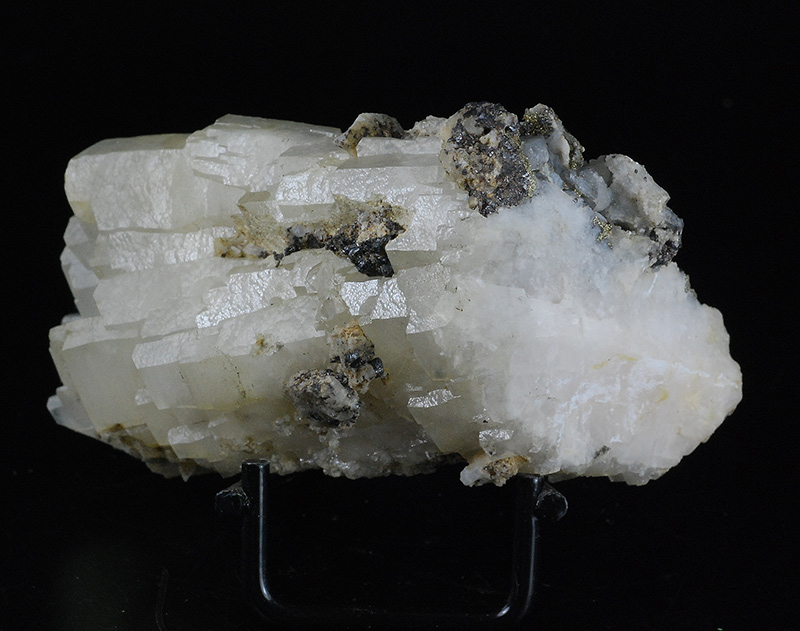 Historic sample from the former Stoppani collection with original label. It's an aggregate of parallel, whitish calcite crystals. The dark areas are covered by microcrystals of pyrite and by larger ones of sphalerite.