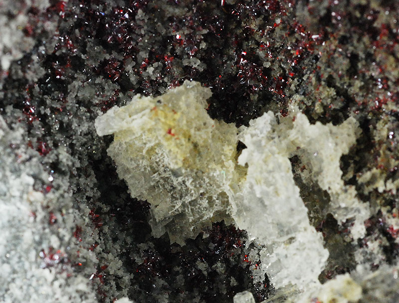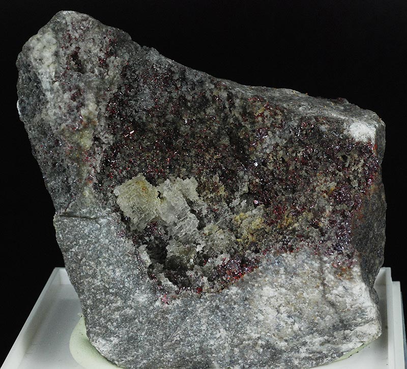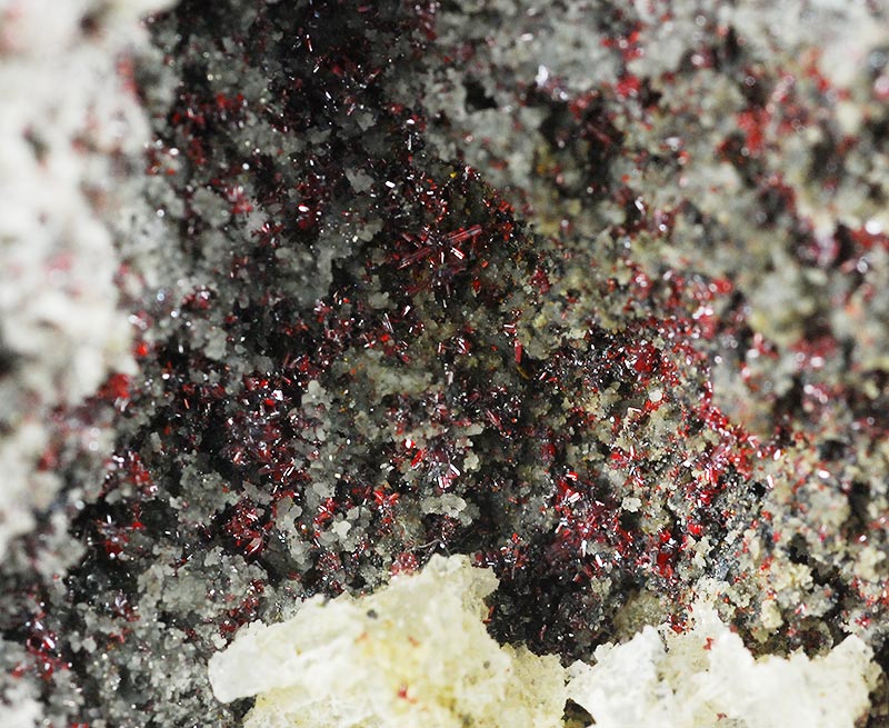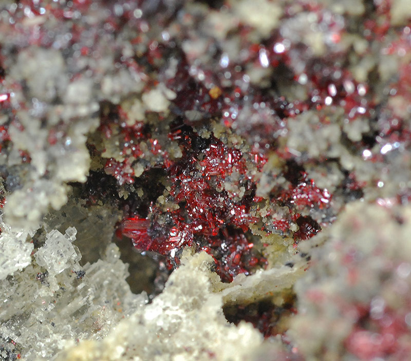 Numerous shiny and dark red proustite crystals are scattered practically over the entire internal surface of this specimen. The whitish residues of quartzite help to highlight a nice color contrast.