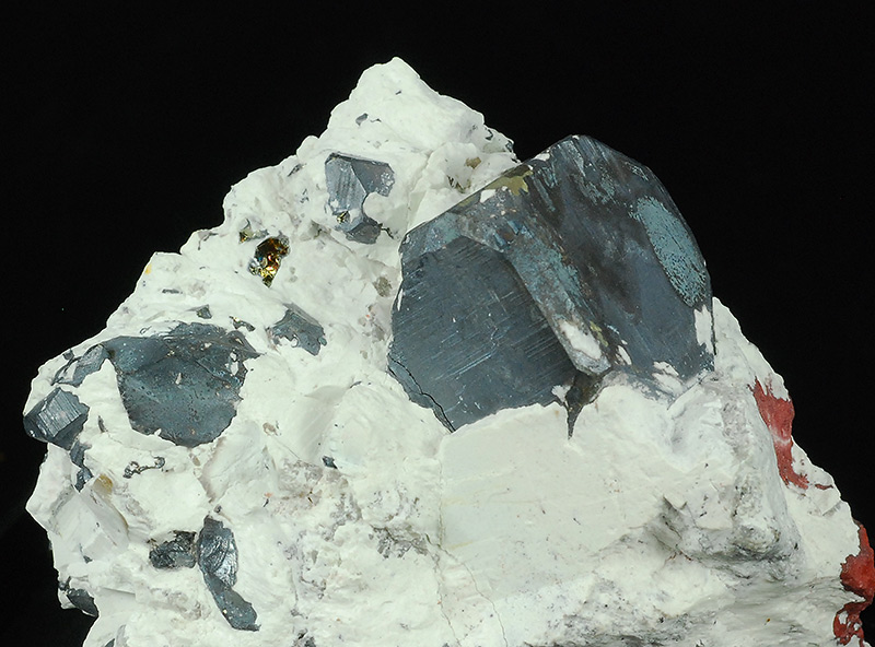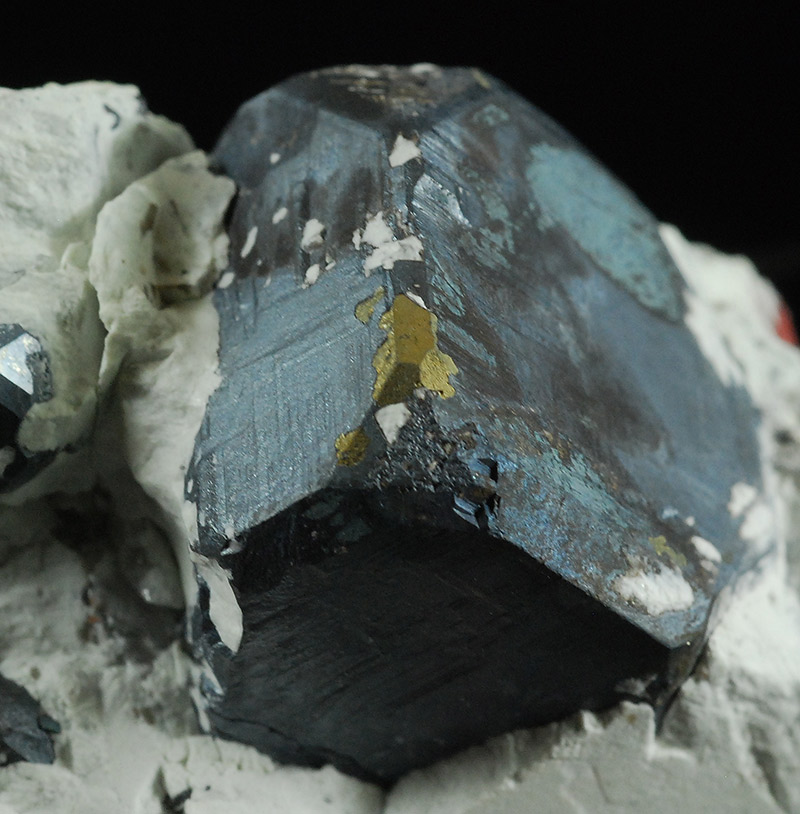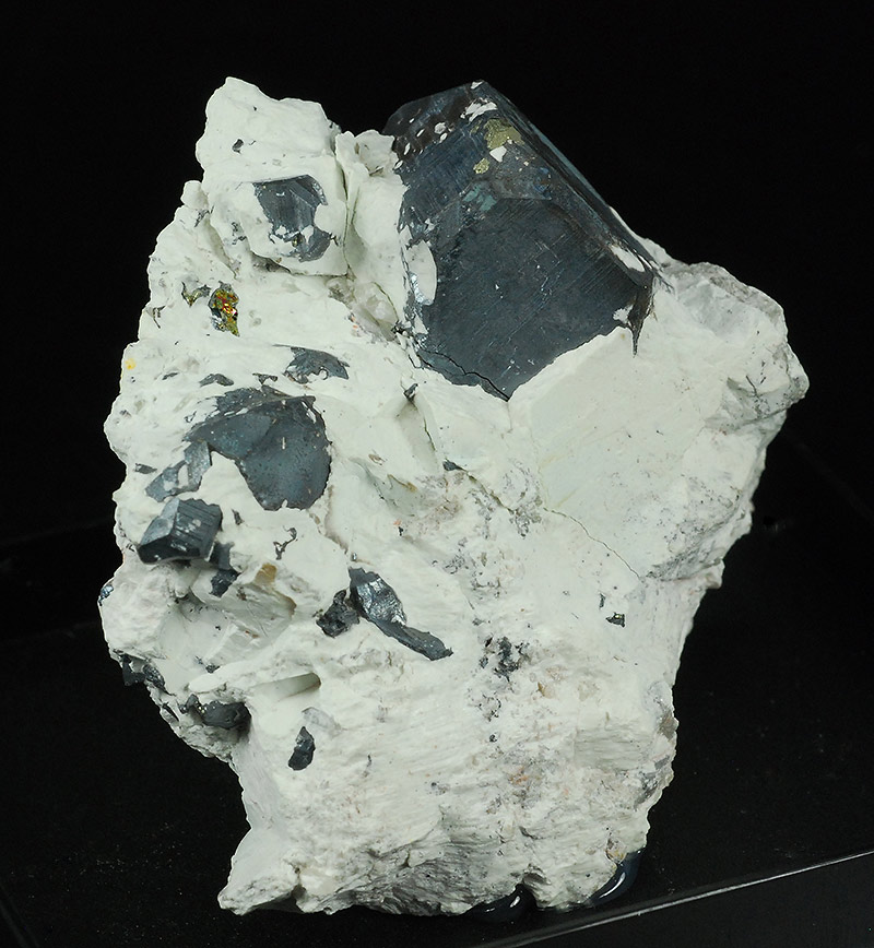 A thin dark layer of bornite covers the surface of the pyrites visible on this specimen. On the main one (18 mm.) there are some small areas where the golden yellow color of the underlying pyrite can be seen. The matrix is made by white clay and provides a stark color contrast.