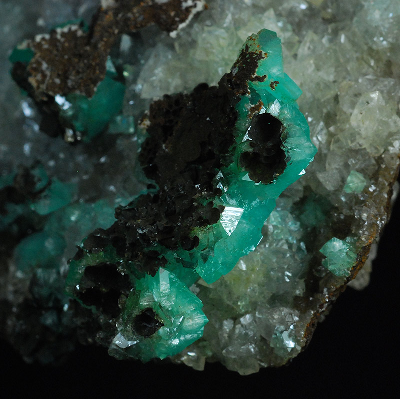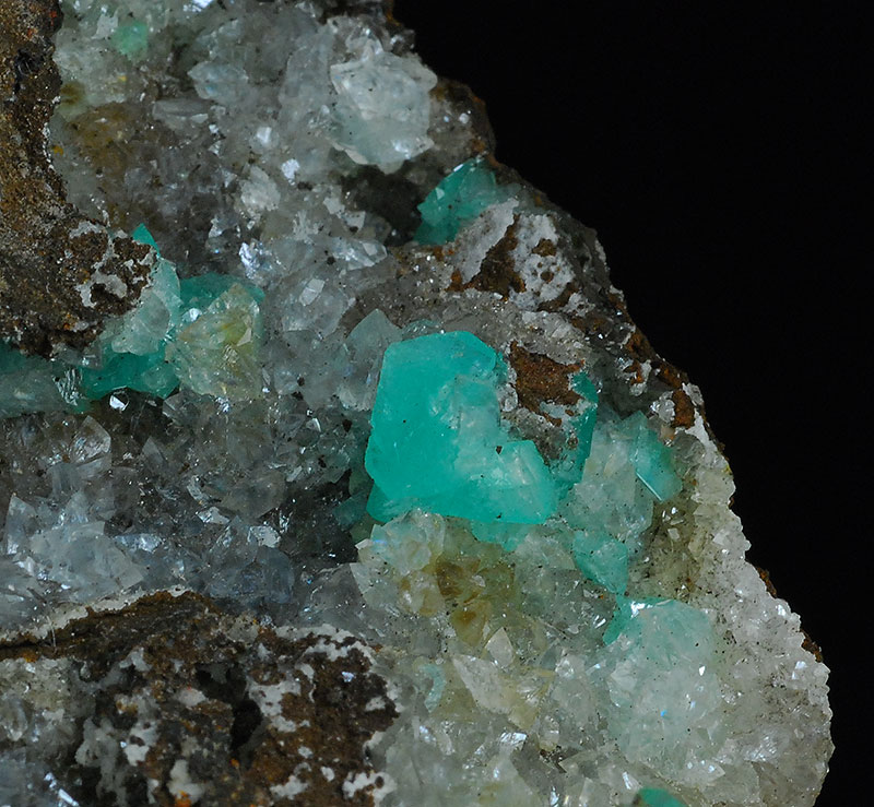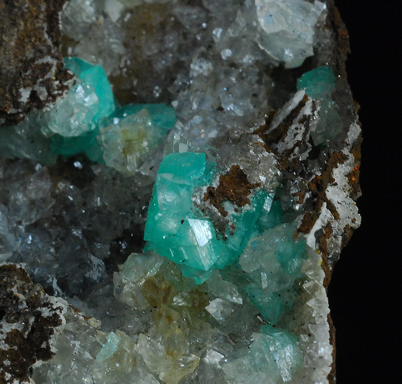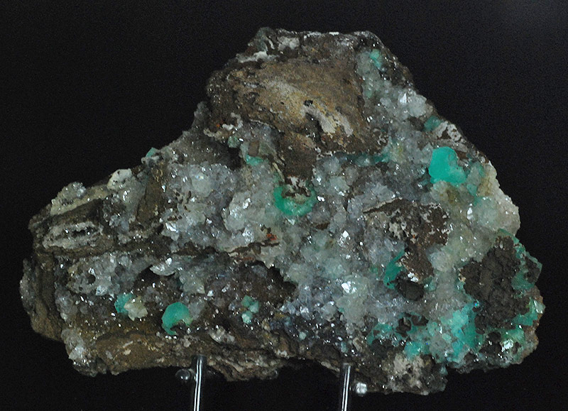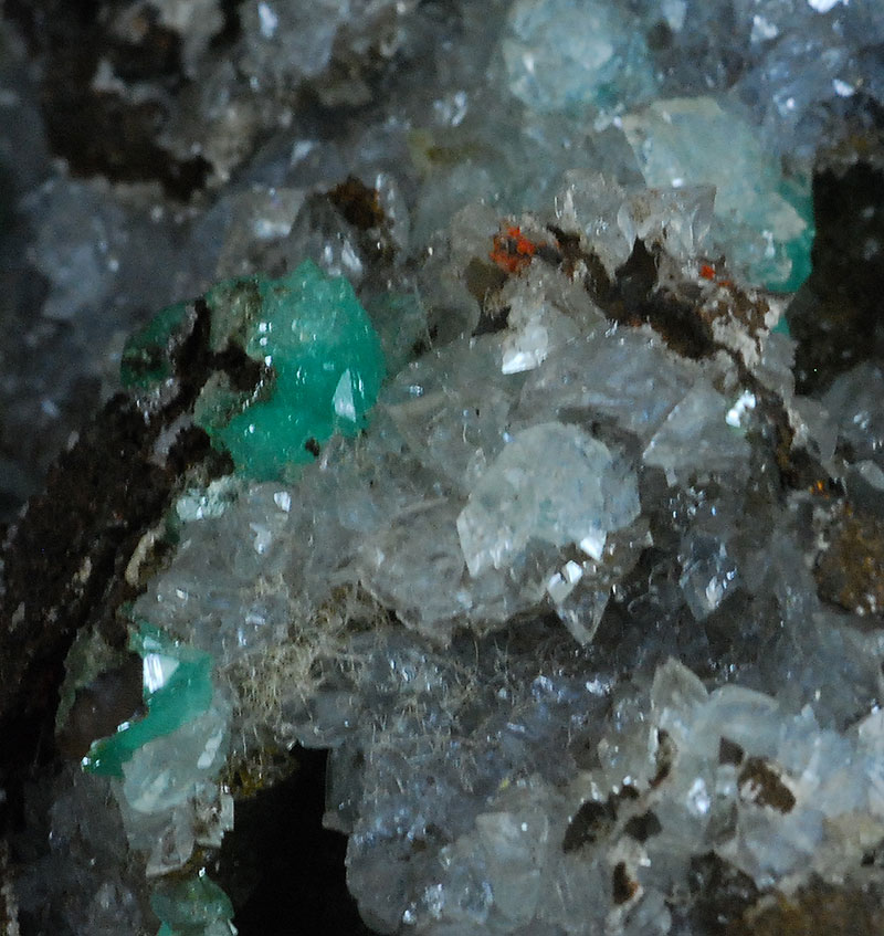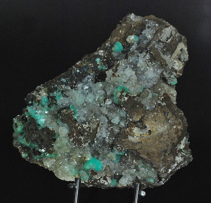 Excellent cluster almost completely covered by almost colorless crystals of hemimorphite. Here and there several blue-green crystals of cuprian adamite are in good evidence. Very aesthetic, with a clear contrast of colors !