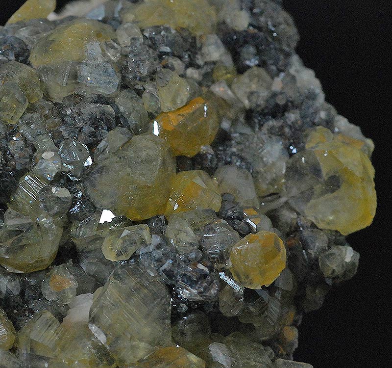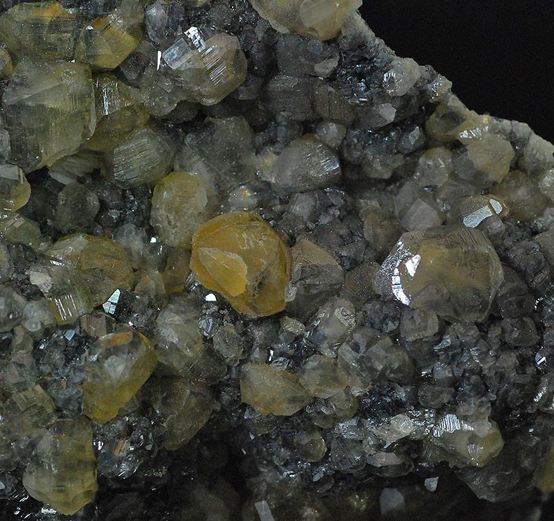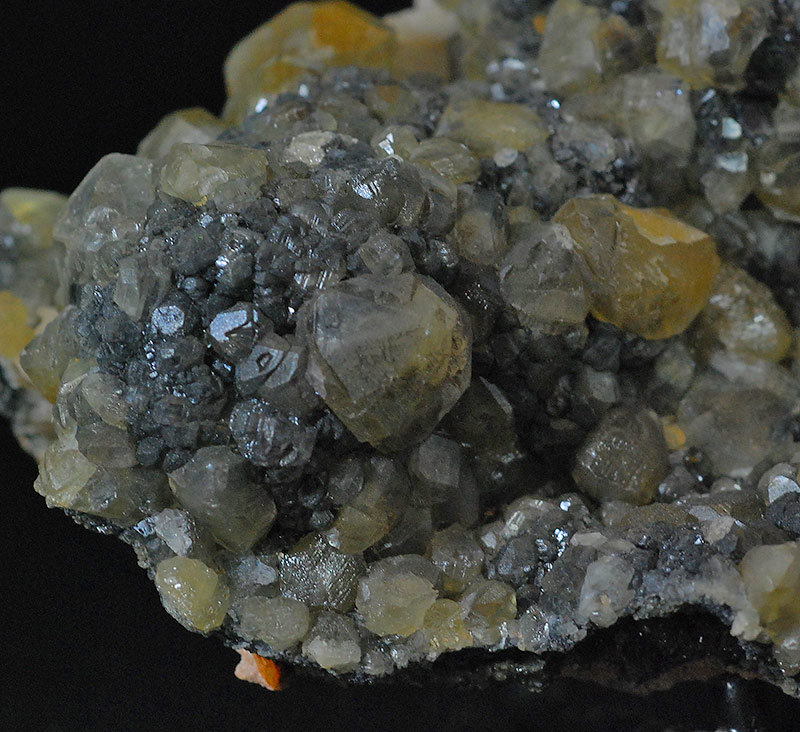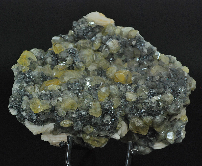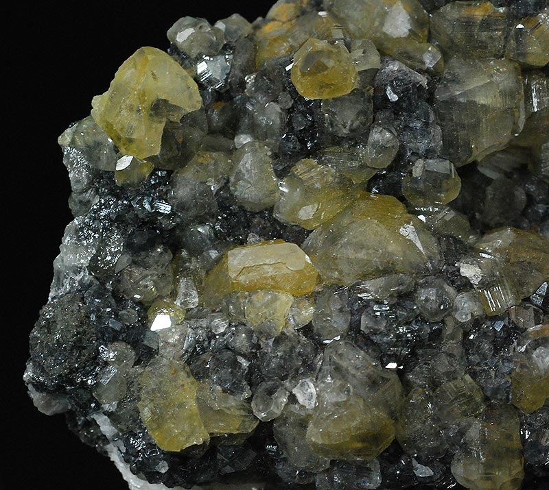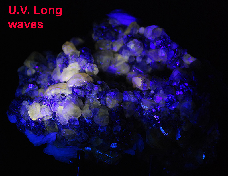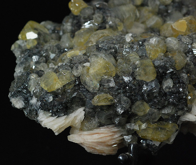 Graceful druse completely covered by small and large, almost botryoidal crystals of cerussite. They have a honey color and are partially transparent too. Some aggregates of thin lamellar pink barite crystals are present on the edges. Cerussites partially turn a beautiful yellow color under long-wave UV light.