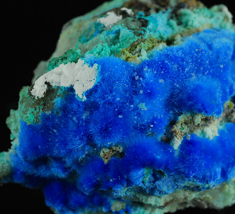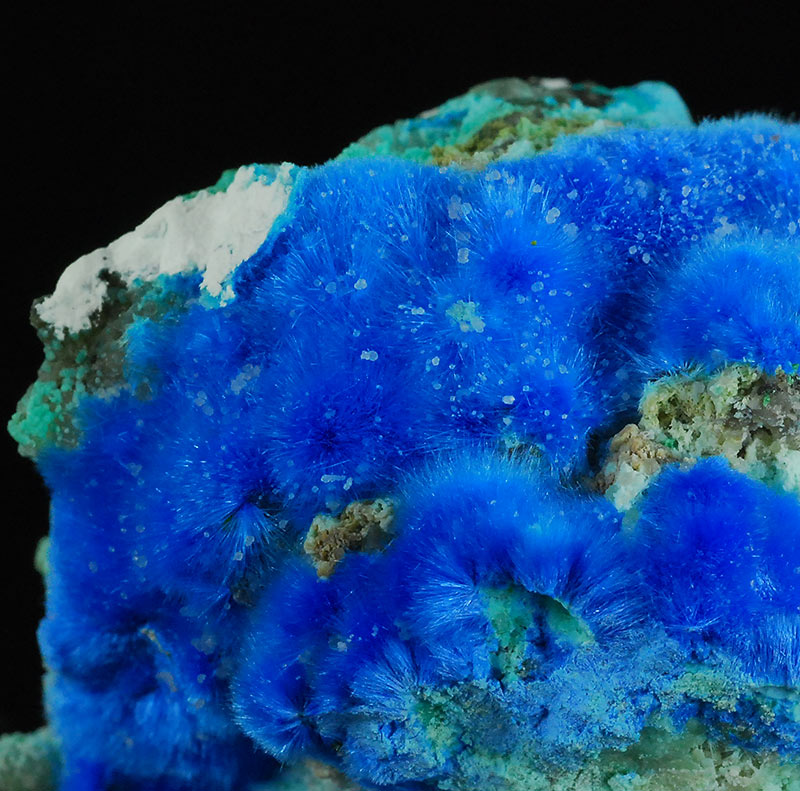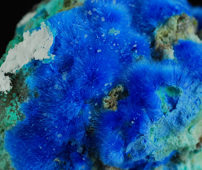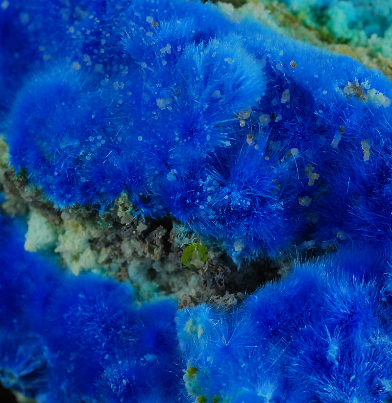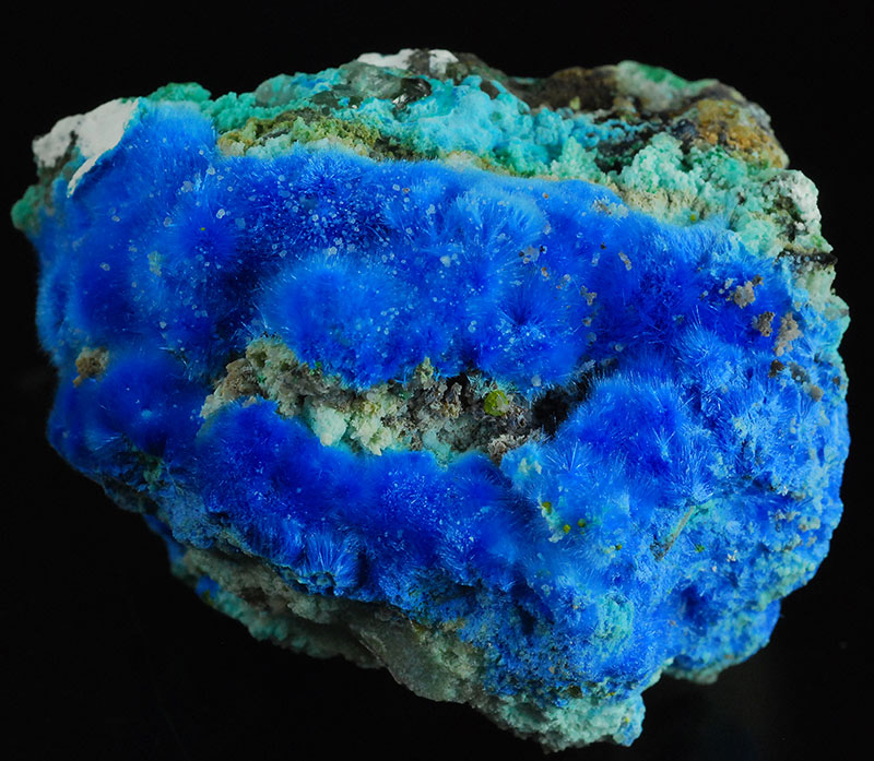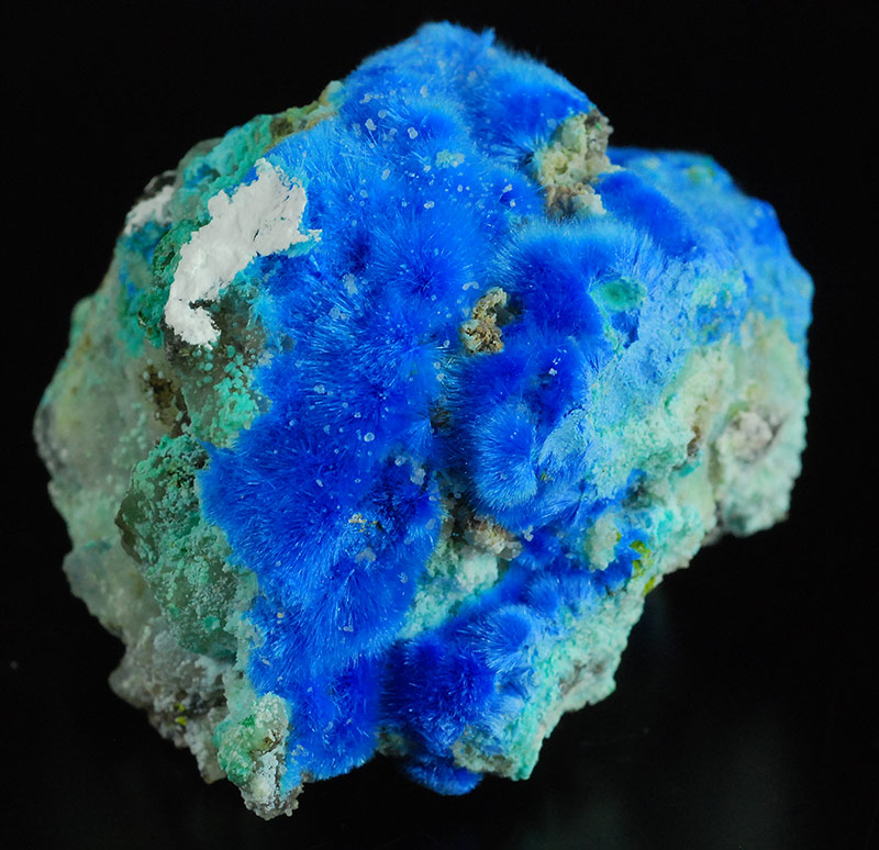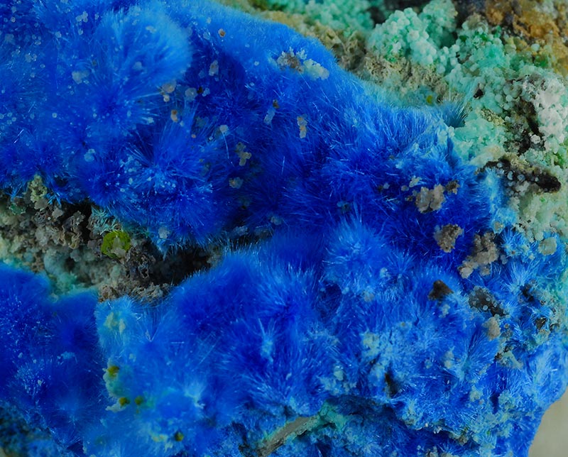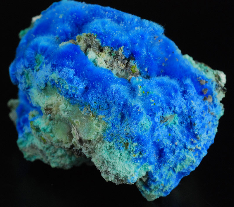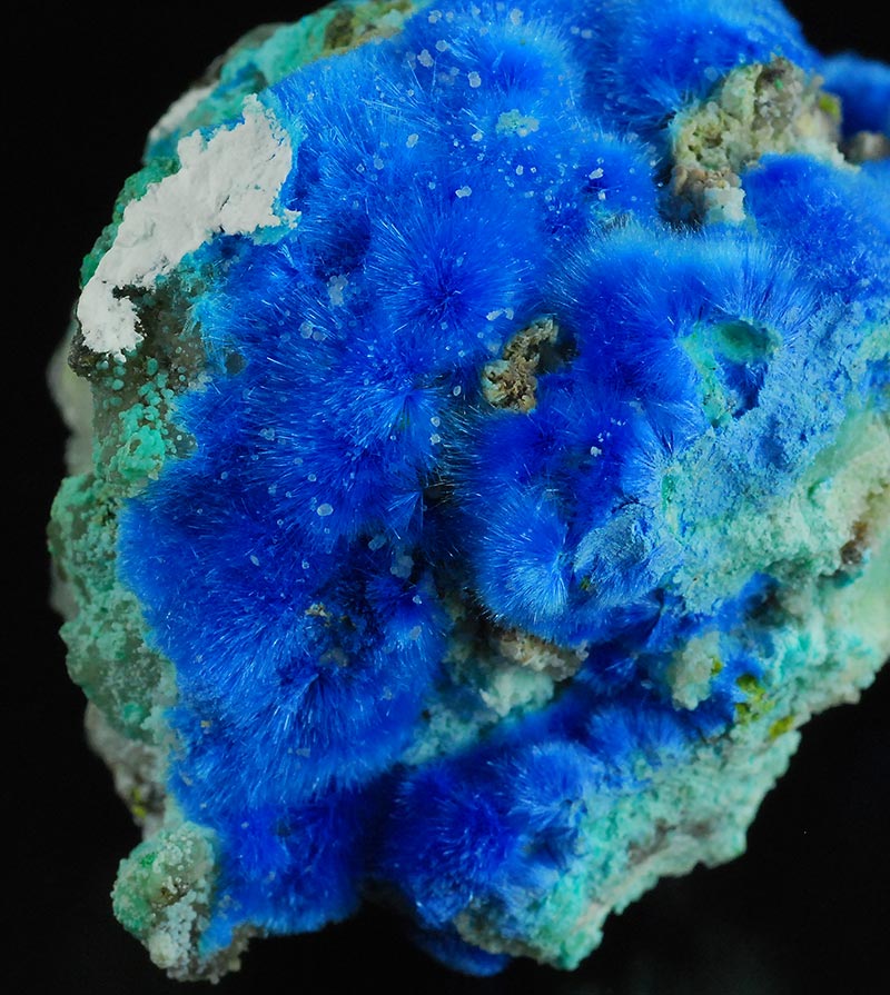 Beautiful specimen that is partially covered by evident, fibrous spheres made of blue electric needles of cyanotrichite. They form a very dense carpet on the surface of this specimen. Very showy !