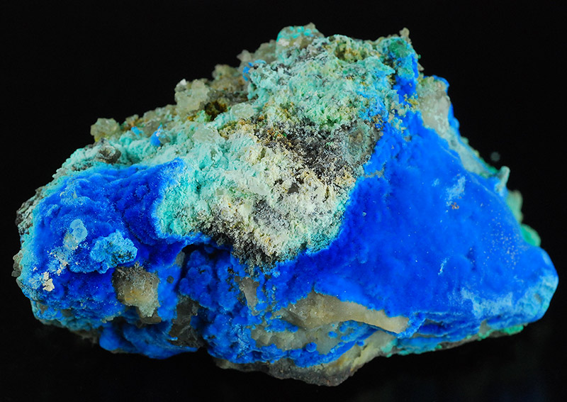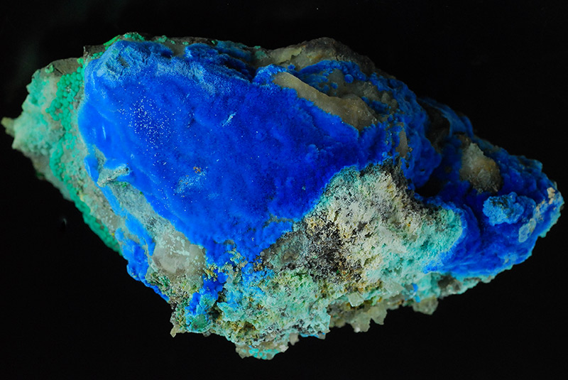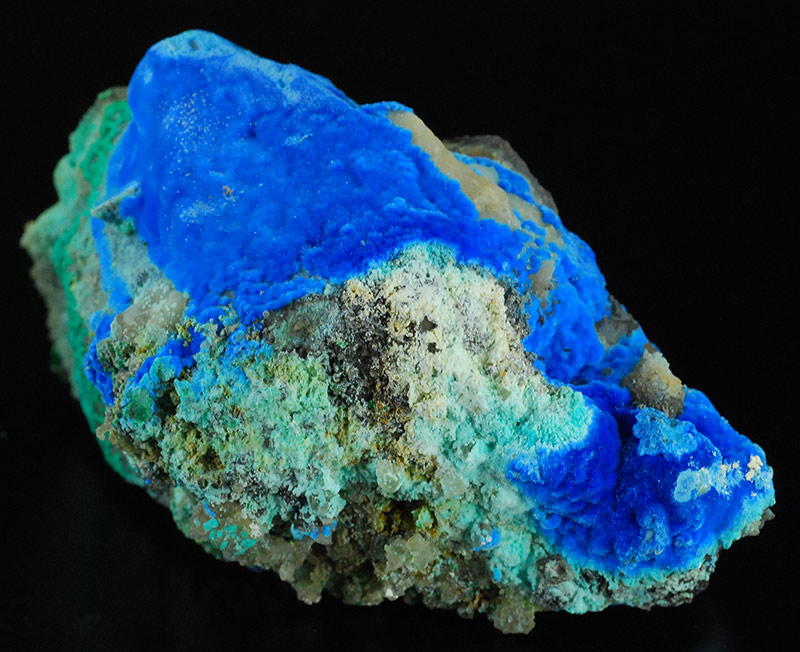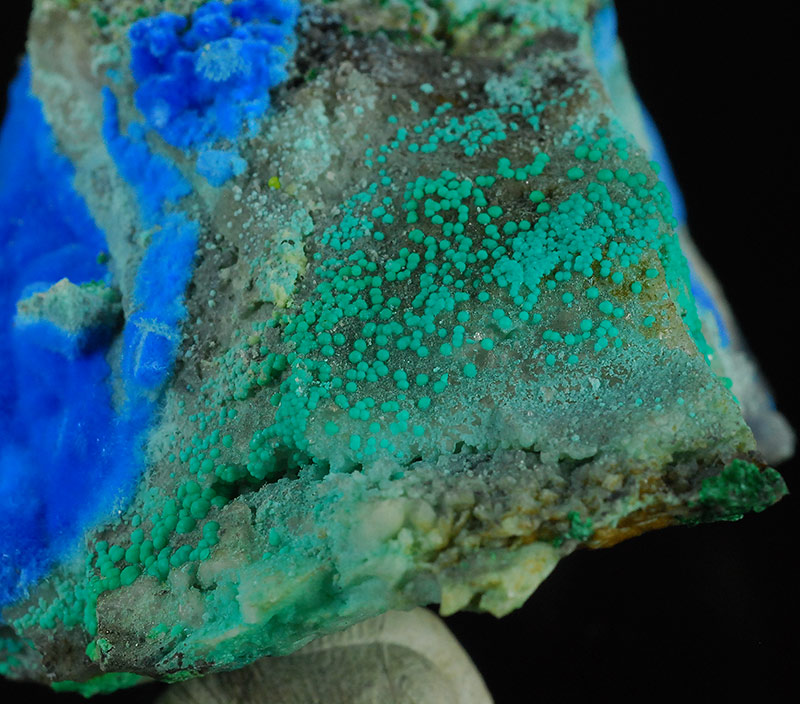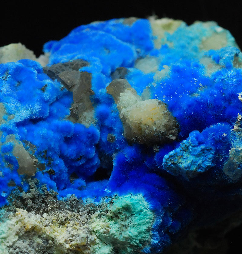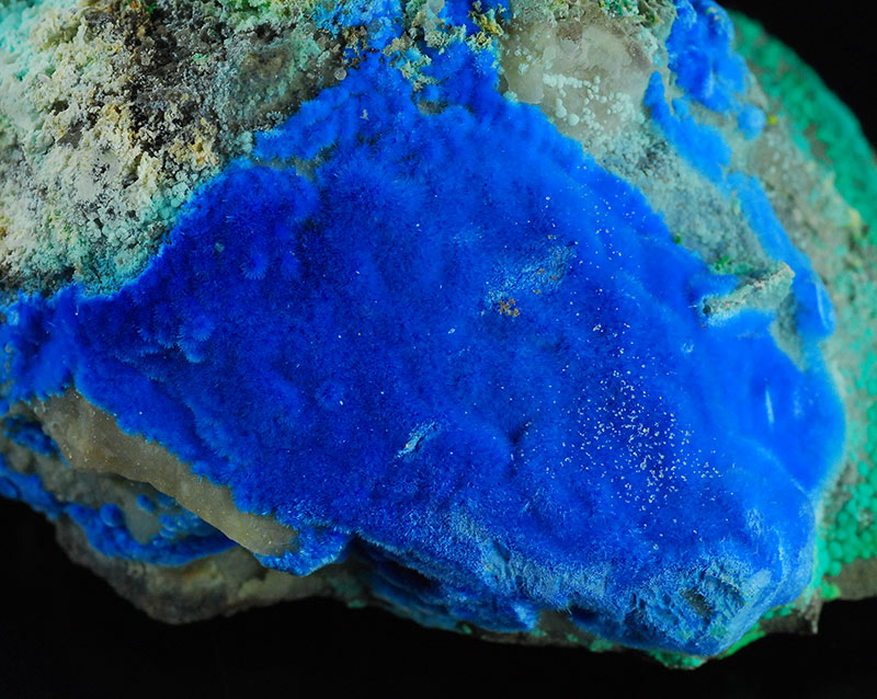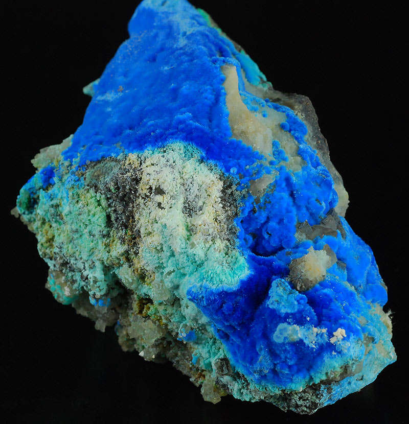 Beautiful specimen that is partially covered by evident, fibrous spheres made of blue electric needles of cyanotrichite. They form a very dense carpet on the surface of this specimen. The small green spheres are of malachite. Very showy !