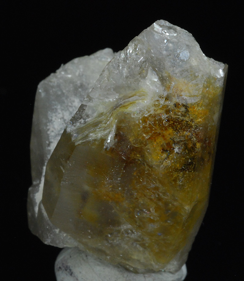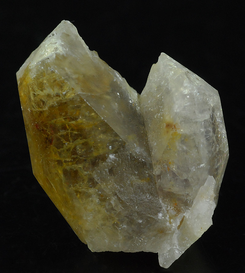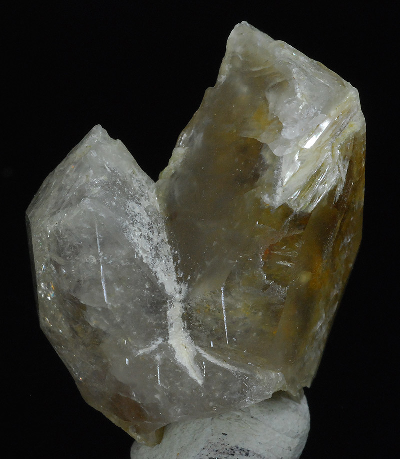 A floater made of a pair of hydroxylherderite crystals. The main one is semi-transparent.