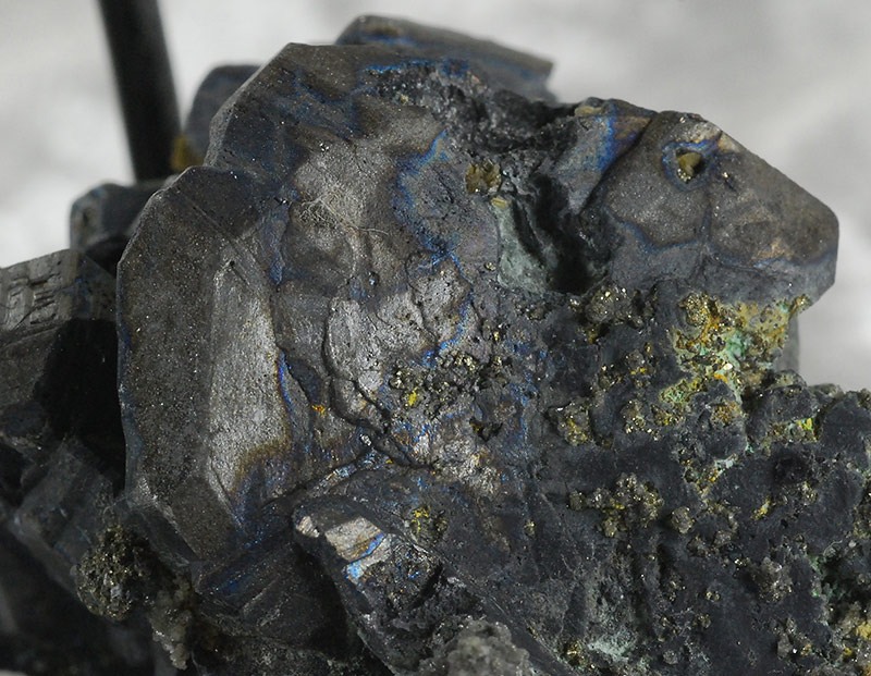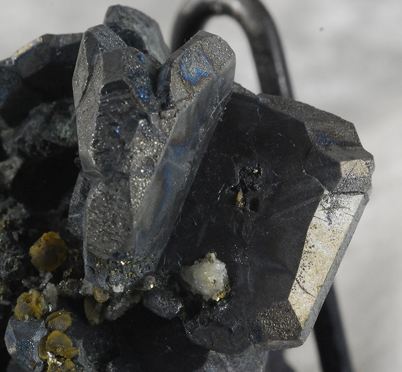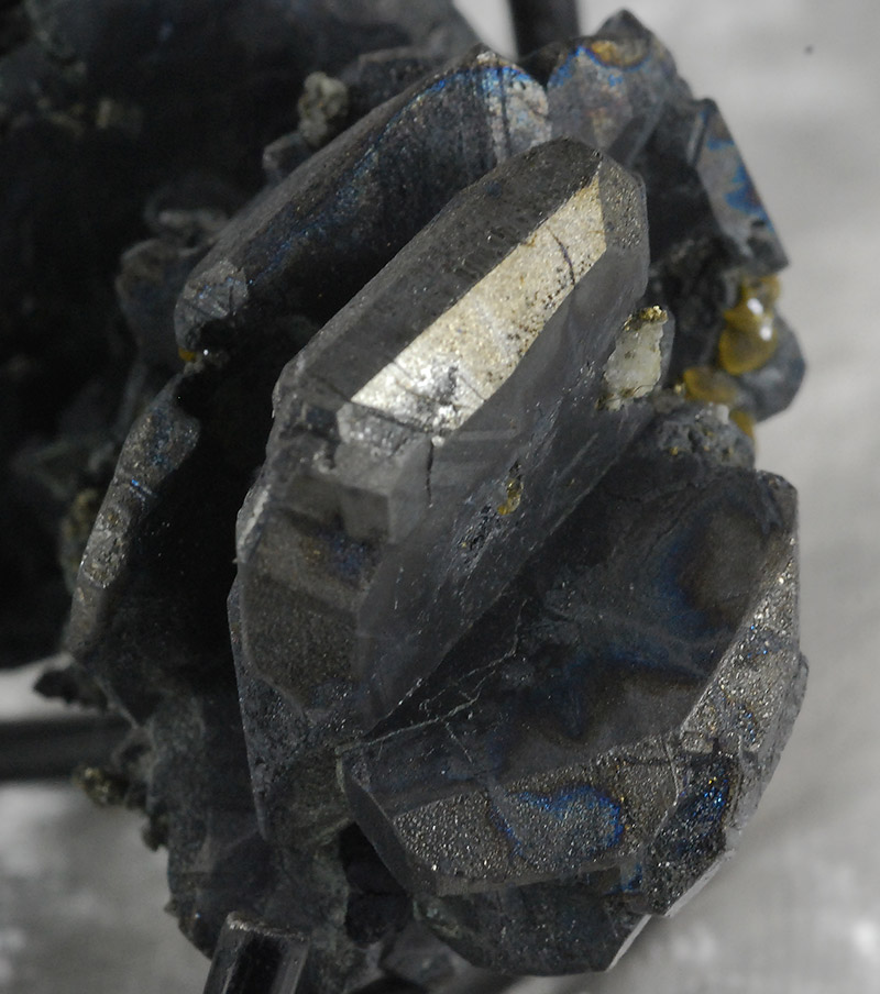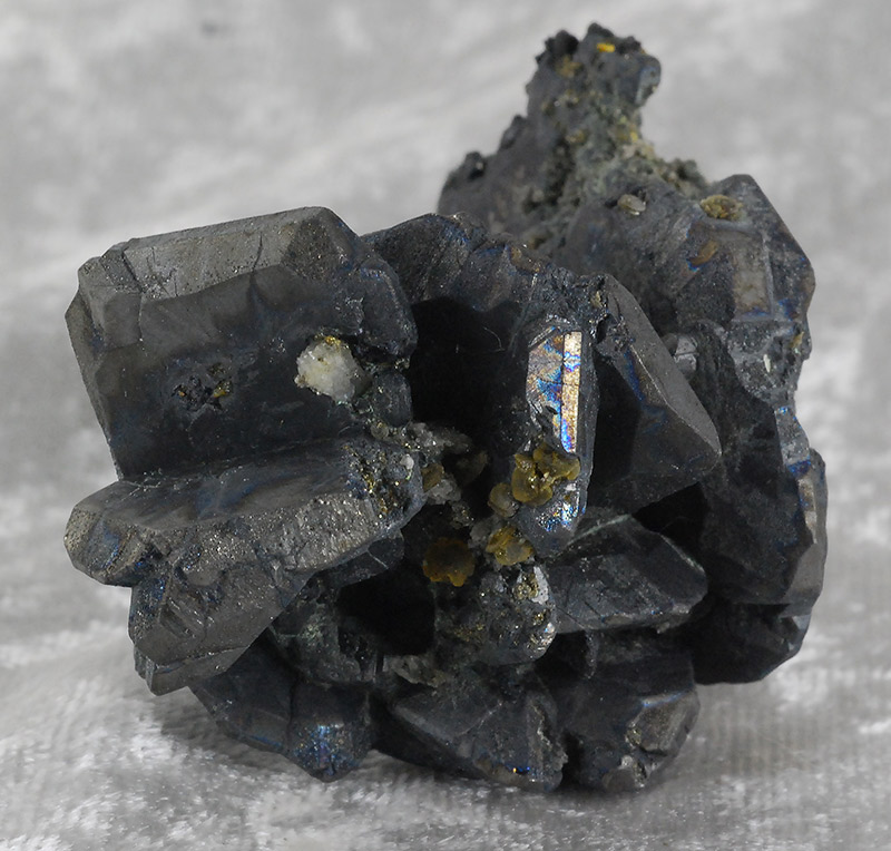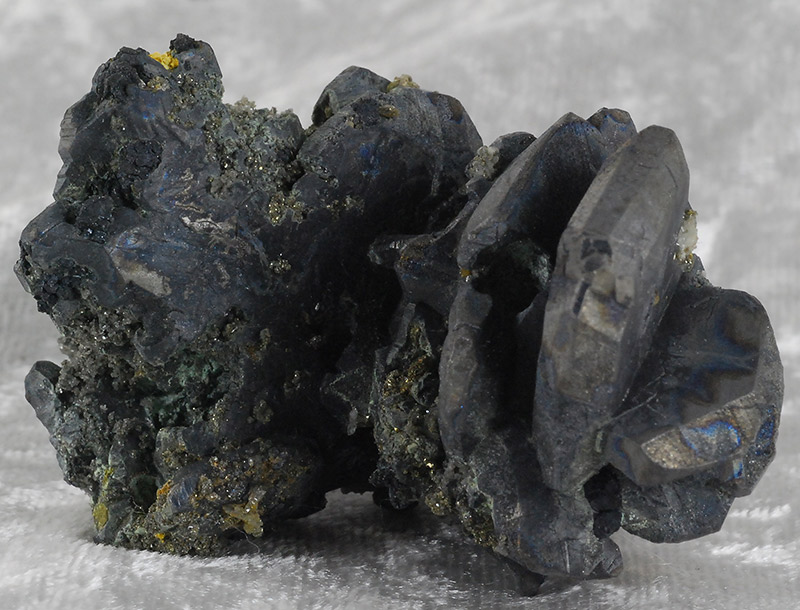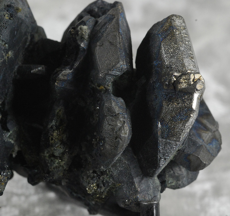 It is composed of large and small dark gray bournonite crystals, placed side by side on a pinch of matrix.