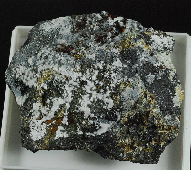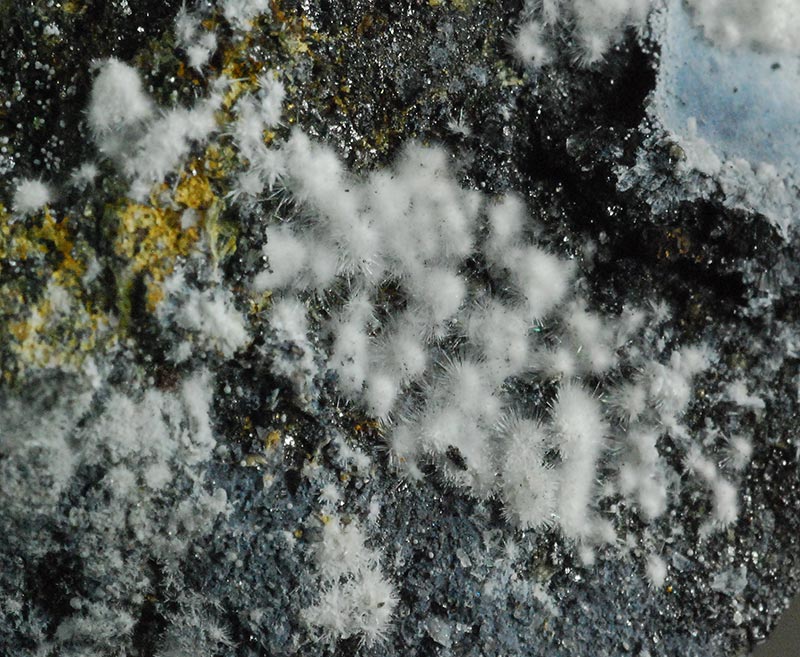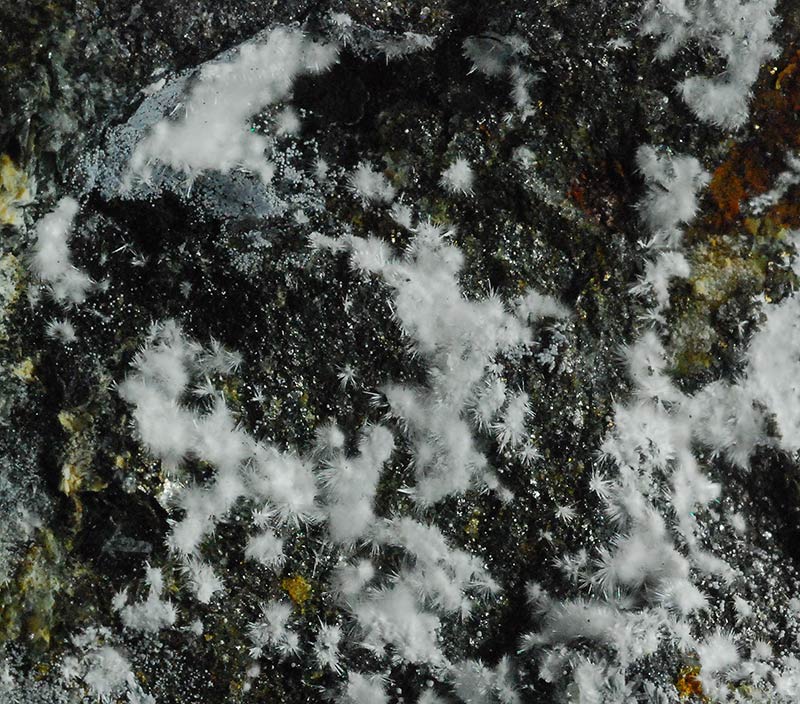 The surface of this specimen is almost completely covered by rosettes of snow-white needles of canavesite. It's an extremely rare borate and this isthe