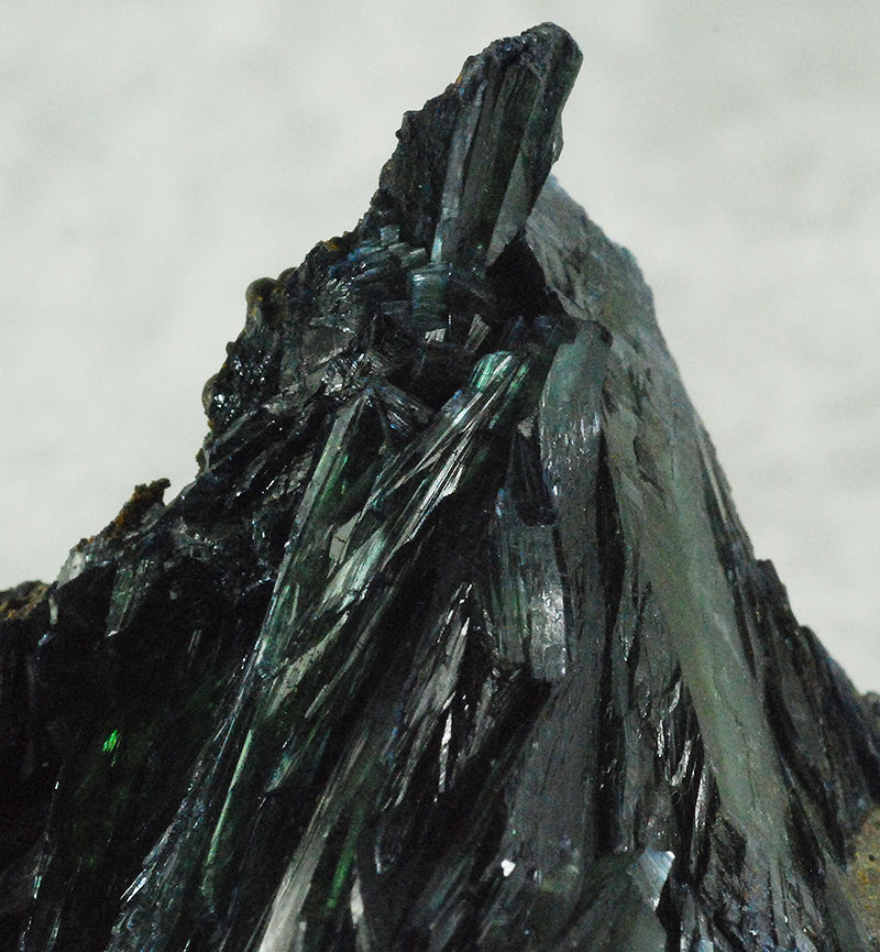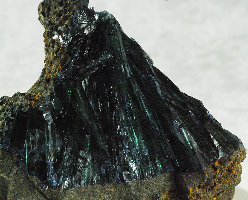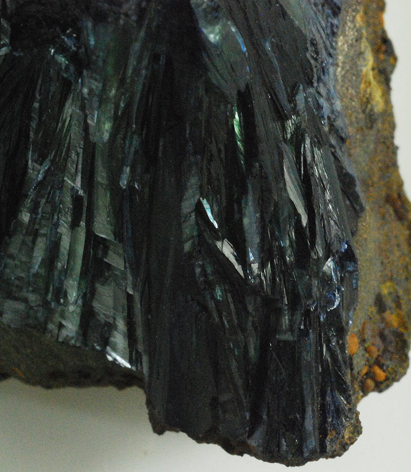 From a recent find in Amazonas, a sample of remarkable quality. Long and shiny crystals of vivianite with a very dark blue-green petrolium color are arranged over the surface of this sample. The matrix is consolidated to prevent it from continuing to produce dust. It's glued to the plastic base. Very showy !