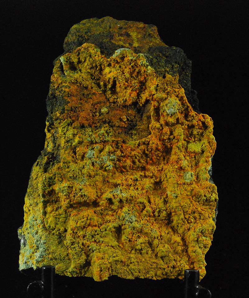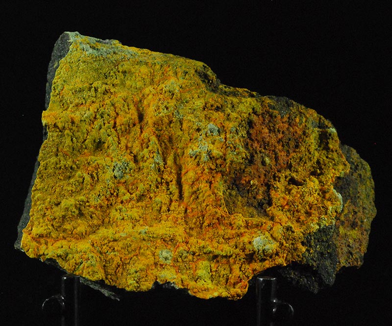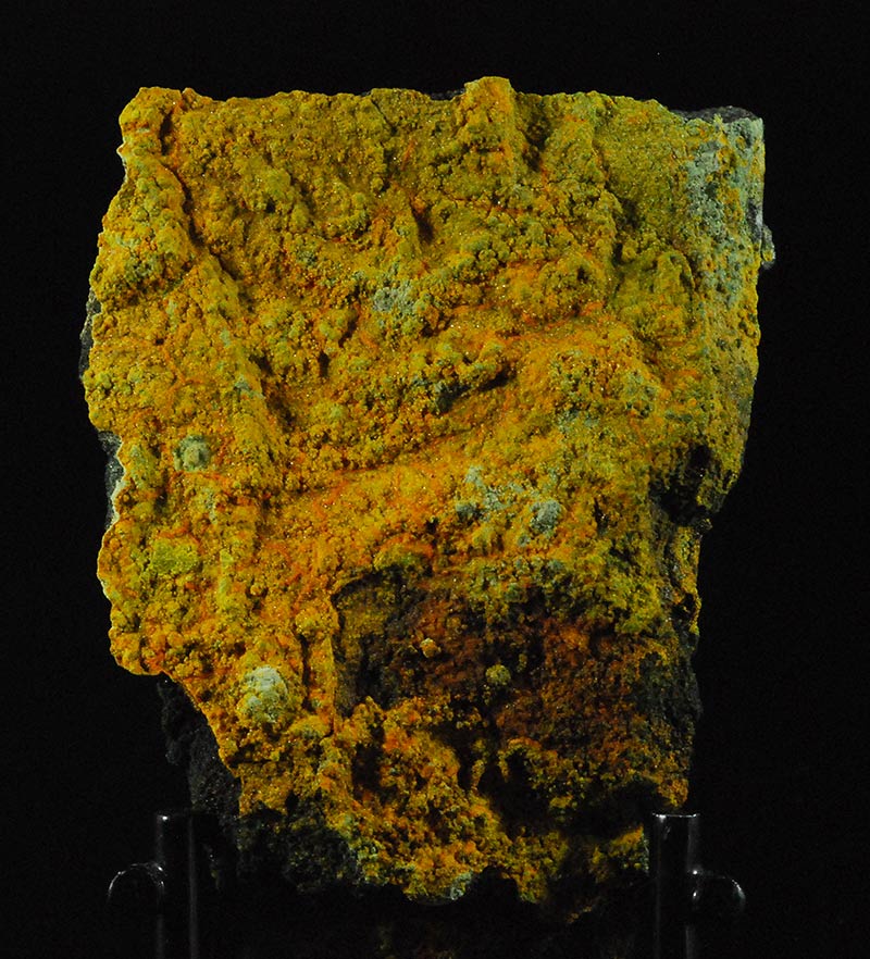 A crust of mini granules covers the surface of this specimen. The orange colored areas are pascoite, the yellow-green ones are metarossite. Former mineralogical collection of Sandro Maggia: no. P-85.