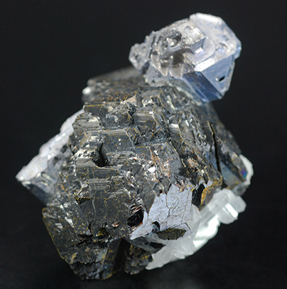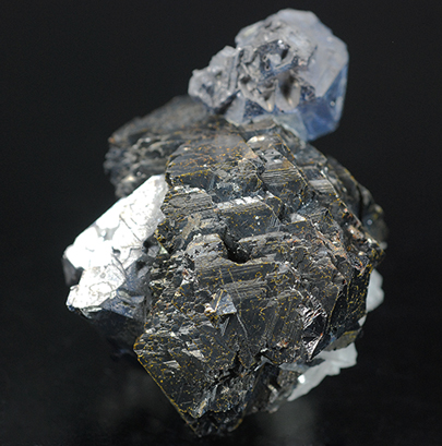 A complex aggregate of grey crystals of galena and dark crystals of sphalerite, that are intergrowth together. Some colourless crystals of quarts are visbile at its bottom.