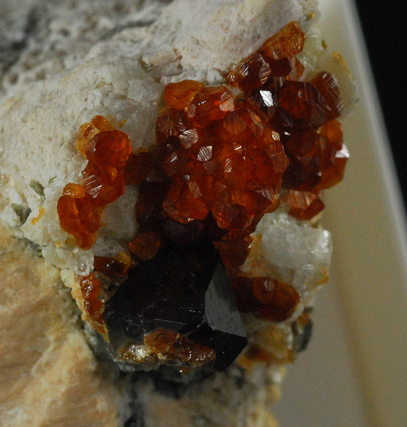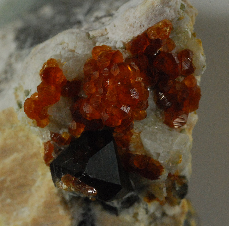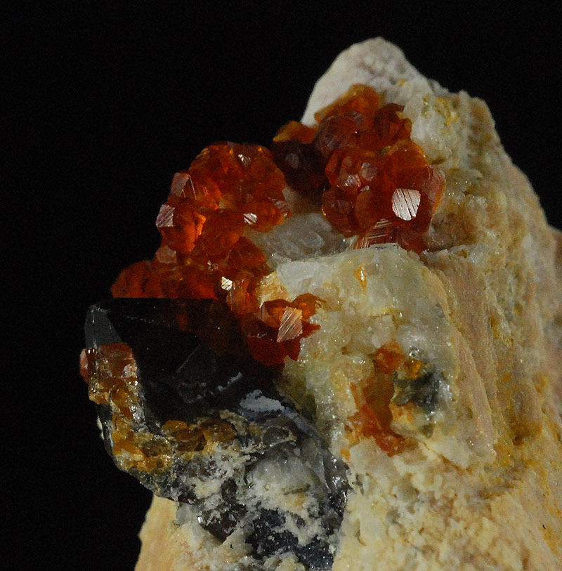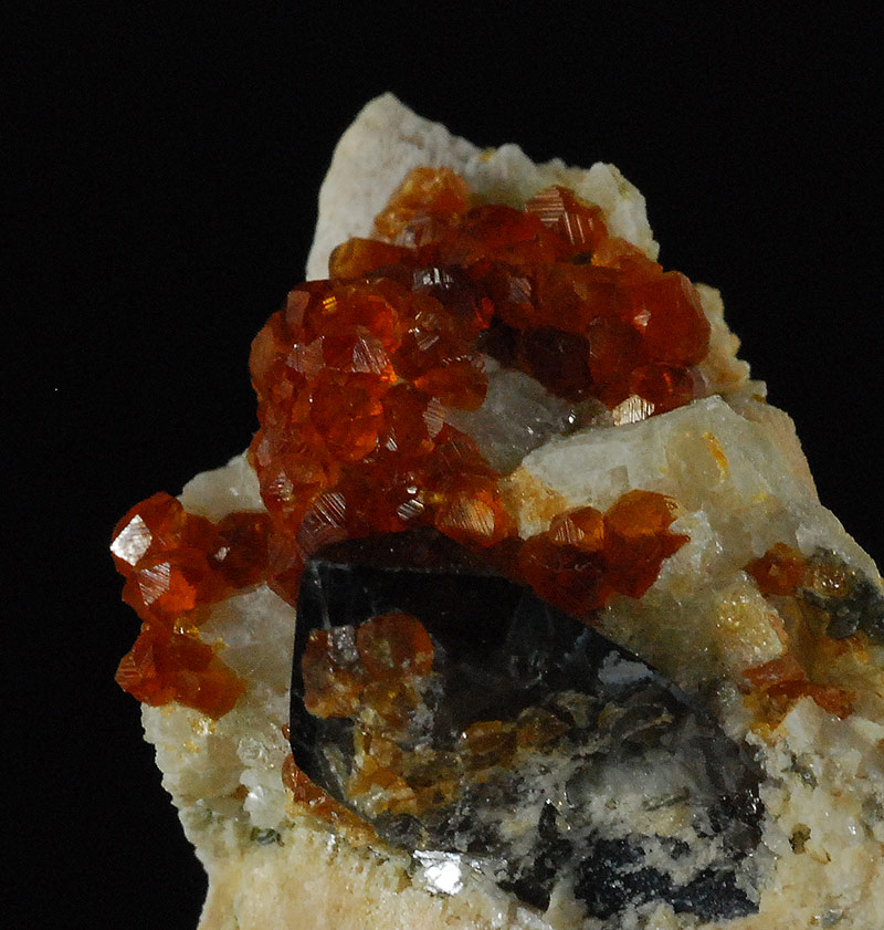 Several small, bright, orange-red spessartine crystals are visible at the tip of the specimen.