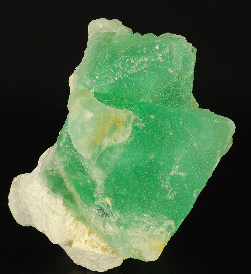 A large, semi-transparent, octahedral crystal of intense green color is flanked by another smaller one.