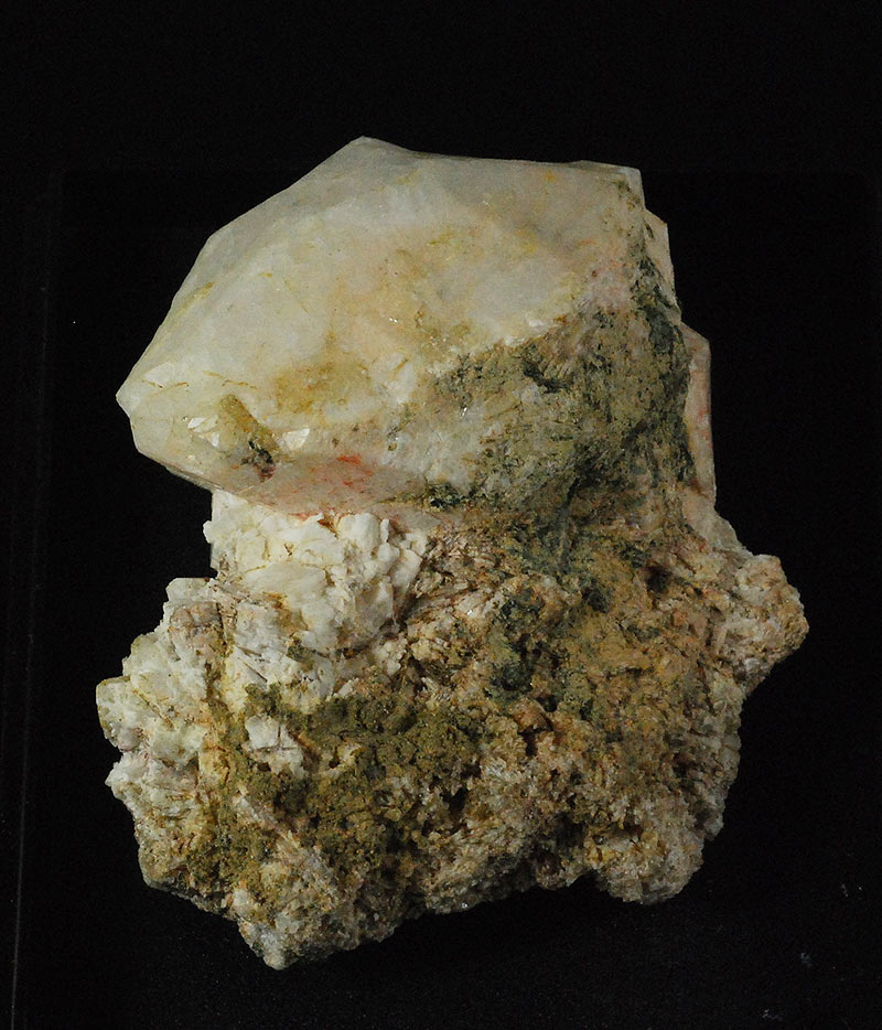 A large white crystal of analcime is prominent on the matrix. A classic specimen from this well-known Alpine location that has given so many specimens to collections around the world.