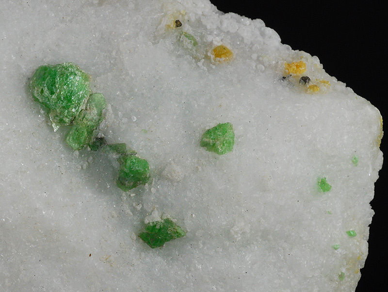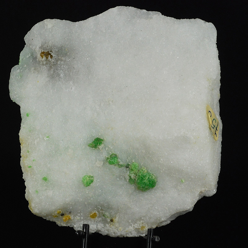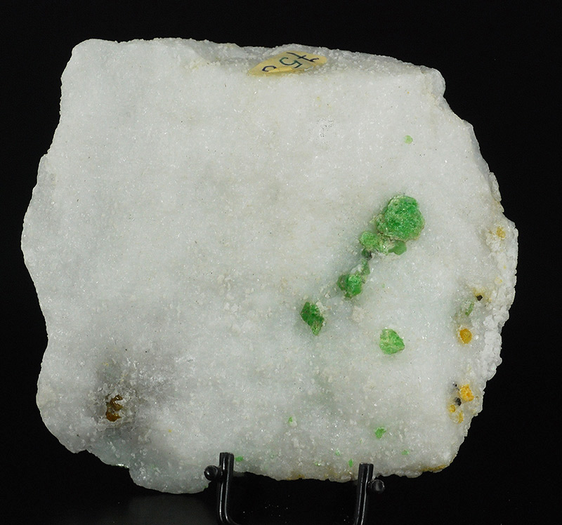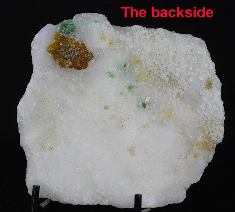 Some green pargasite crystals are clearly visible on the white matrix of saccharoid marble. On the back you can see a large brown crystal of hydroxylclinohumite, of which a tip can also be seen in front. The sample was etched to highlight the crystals that were completely surrounded by the matrix. From a found of many years ago. The mountain in Vietnam from which were extracted so many splendid specimens that have filled collections all over the world is now completely destroyed from years, so nothing new will reach the market: only specimens from collections that are being sold.