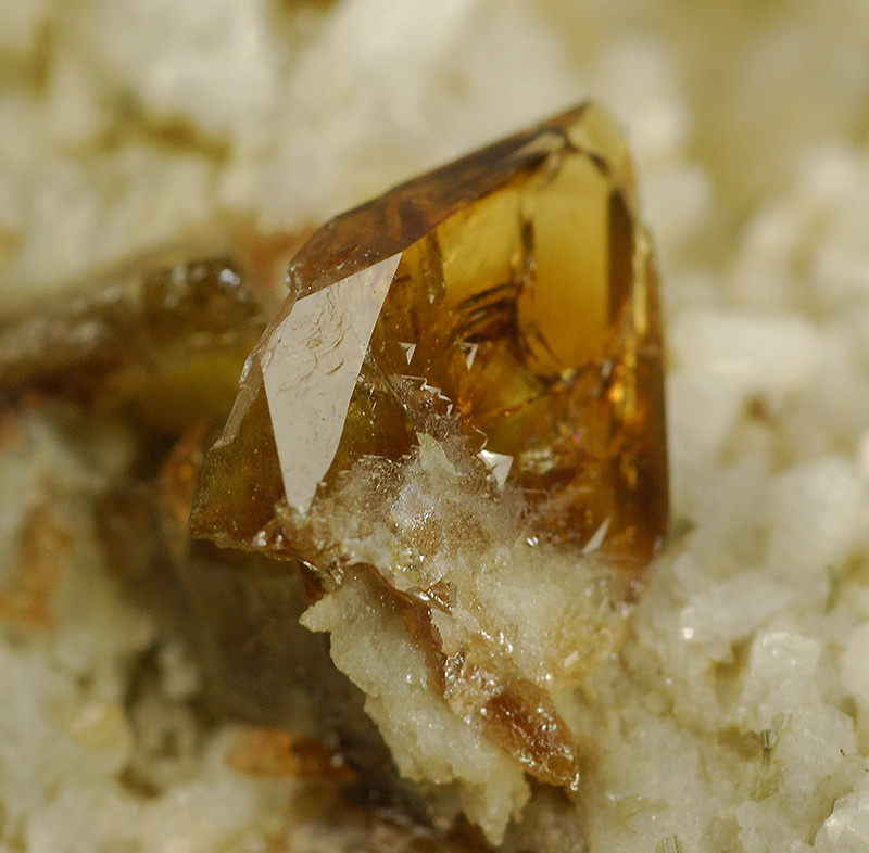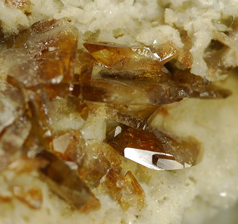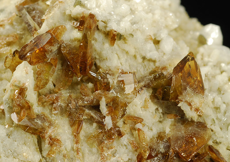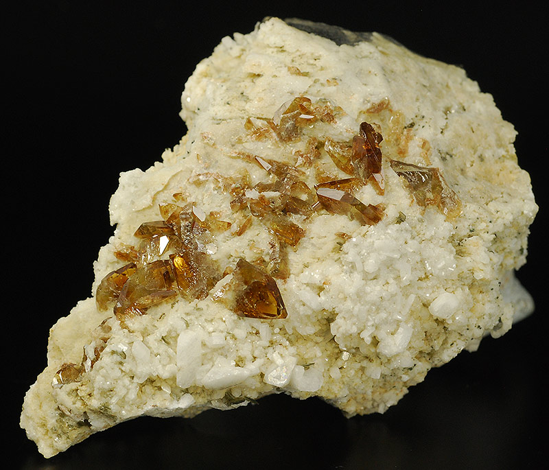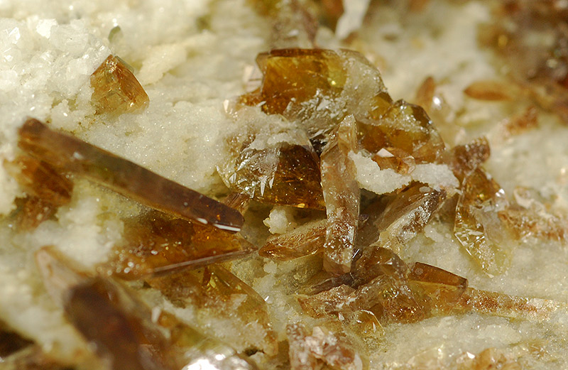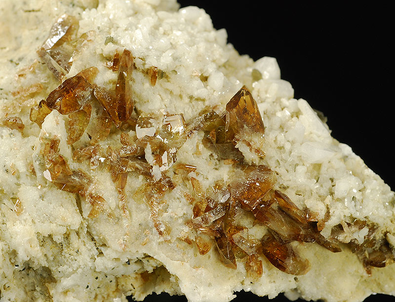 Several transparent, brilliant and brown coloured crystals of titanite are spread all over the white surface of this specimen for a strong contrast.