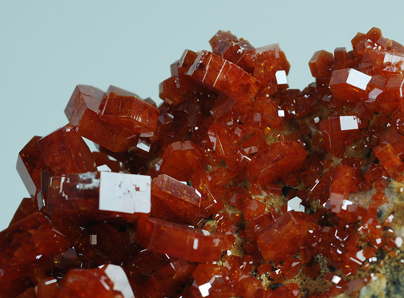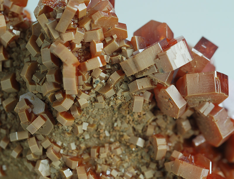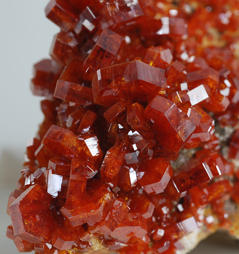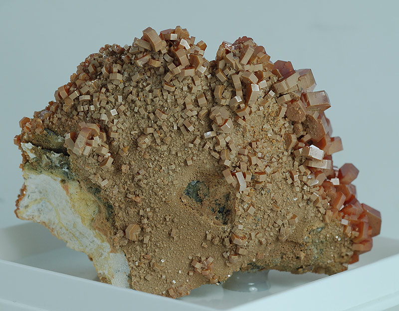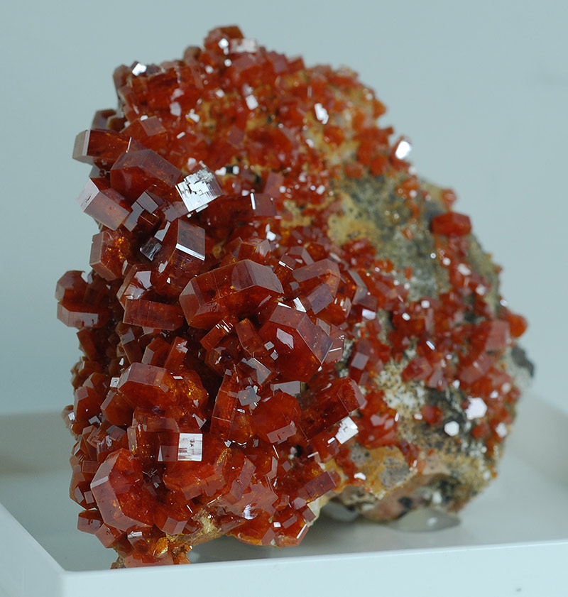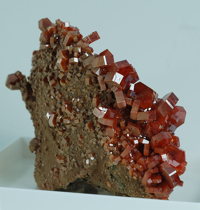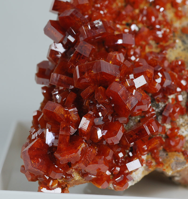 A beautiful druse covered with brilliant and perfect crystals of fiery red vanadinite, which are mostly arranged on one side. The back of the specimen is light brown colored and shows the natural process of transformation into endlichite. Some crystals on the border between the two areas are bicolor. From a recent find in a classic location in Morocco. It is glued to the plastic base.