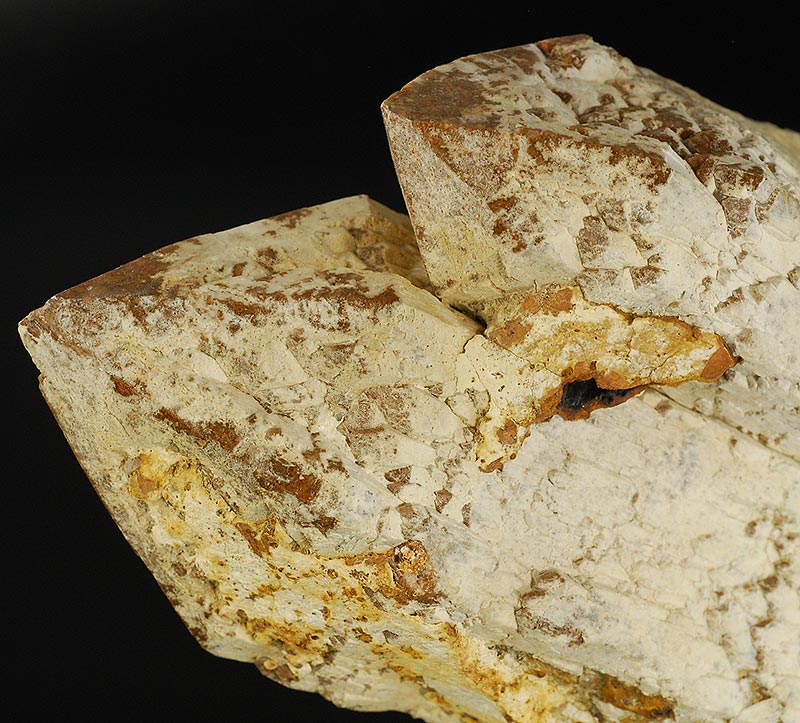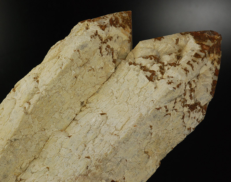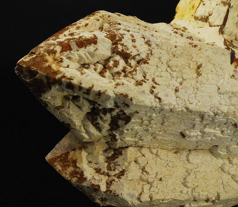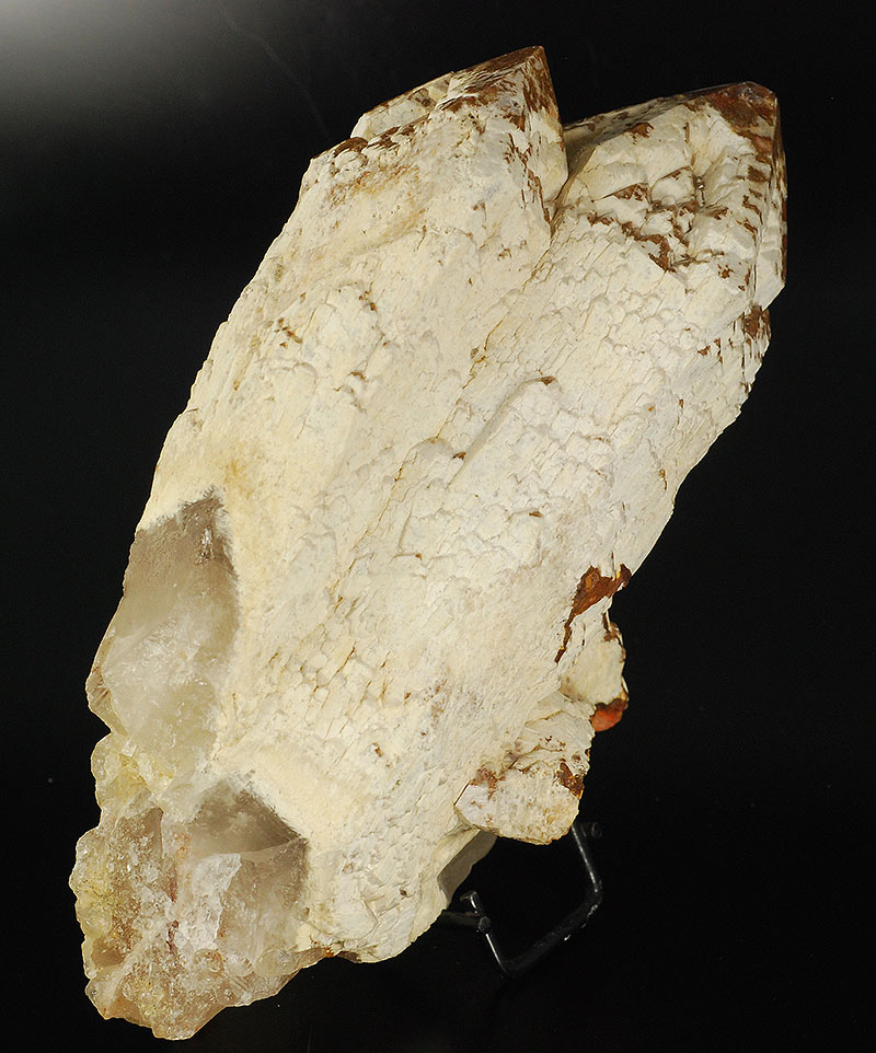 Two long crystals of quartz have the 'fenster' top, with some windows and are partially growth as an 'artichoke', for a curious effect. Their surface is partially pseudomorphed in ortochlase. It becomes from an old collection and is dated 1975, but there was not the exact locality.