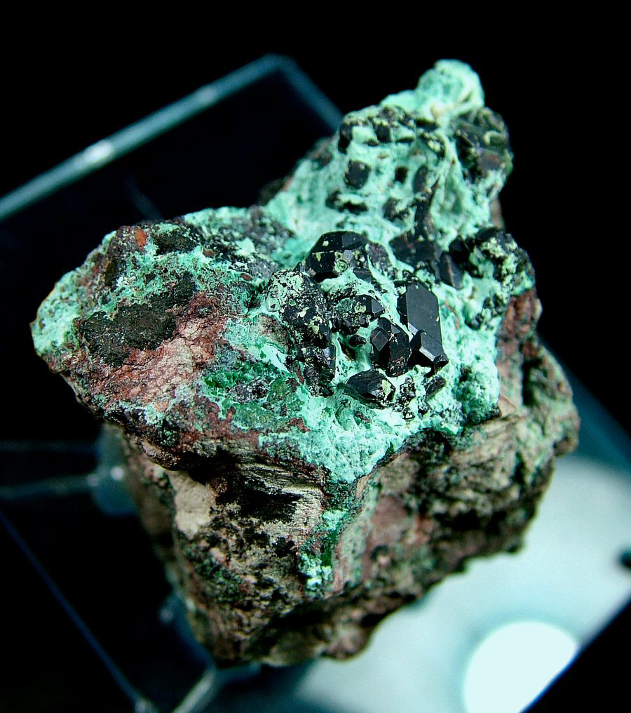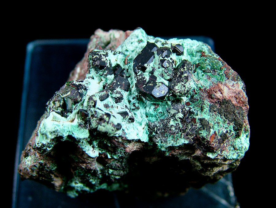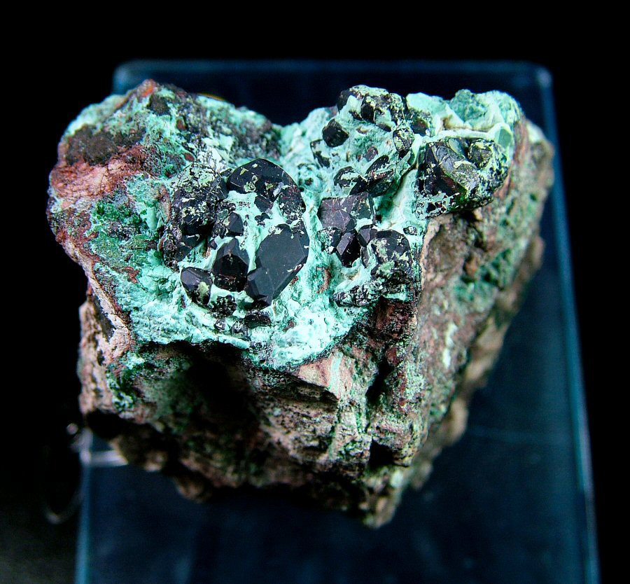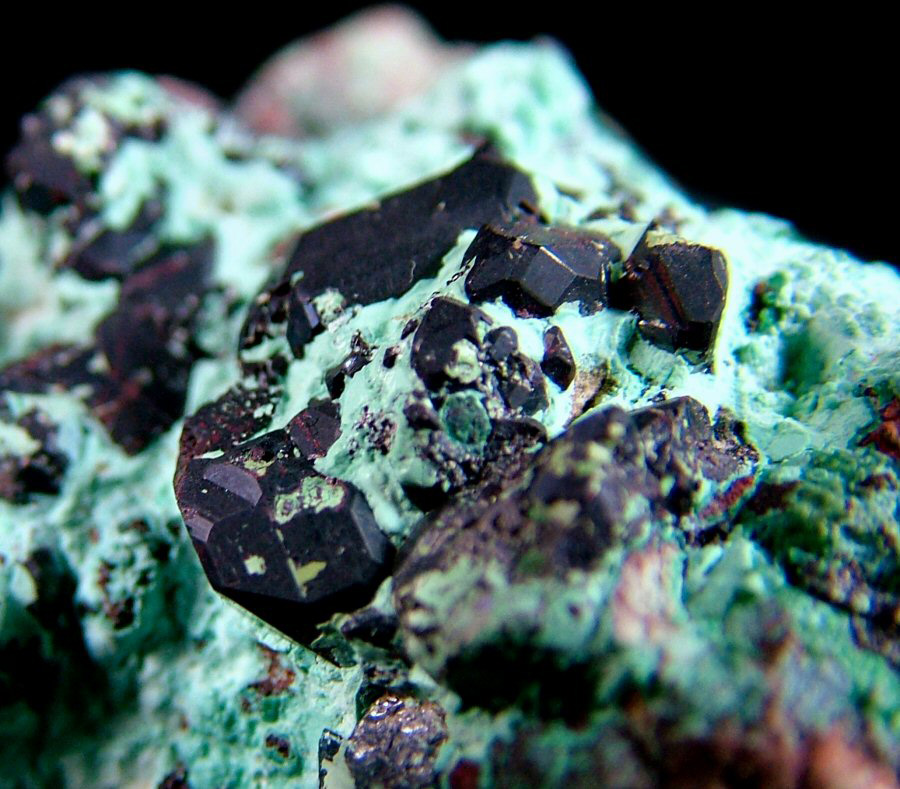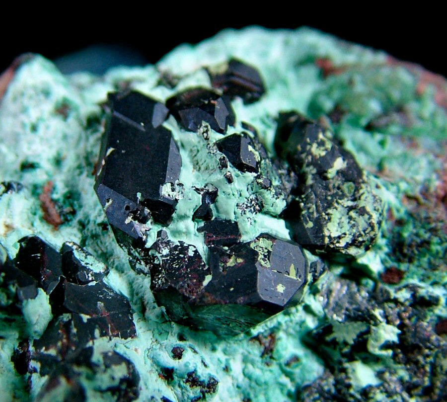 Dark red Cuprite's crystals make a nice contrast with the Chrysocolla, from which they emerge. Ex Cirina collection.