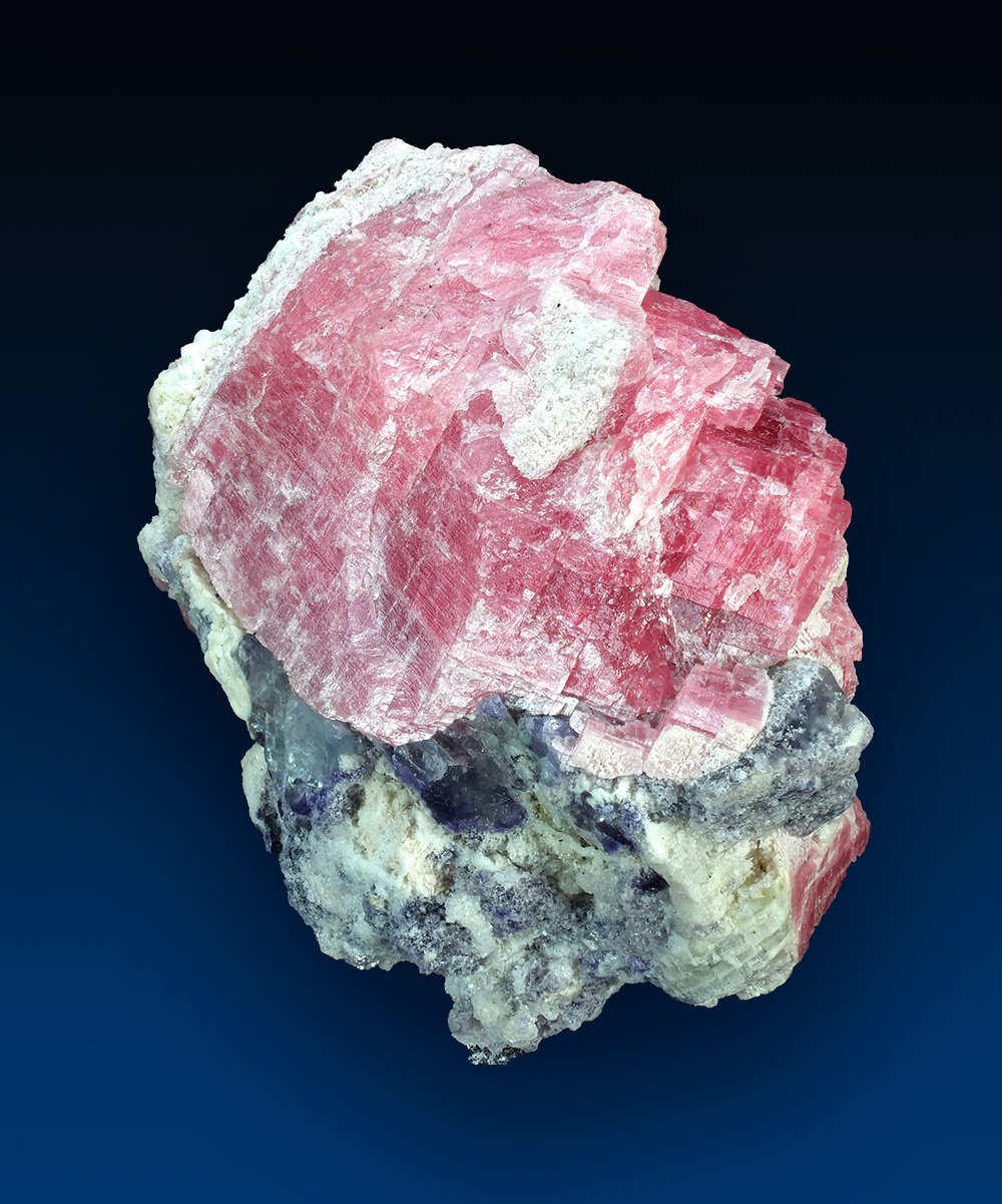 Intense red-pink Rhodocrhrosite crystals up to 3,0 cm on matrix with pale blue fluorite and pyryte in association.