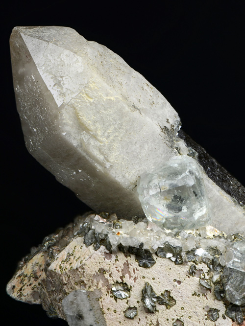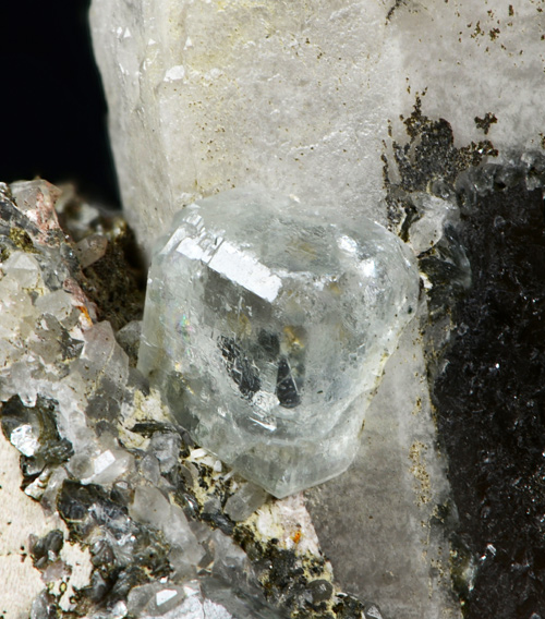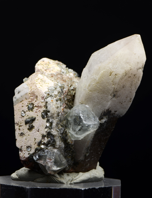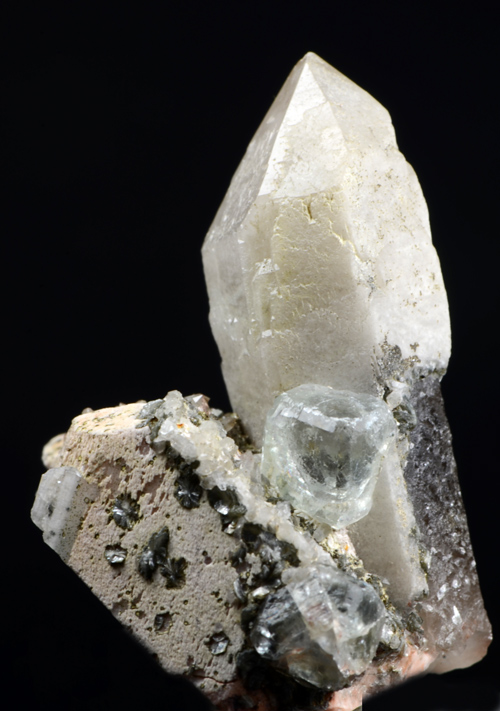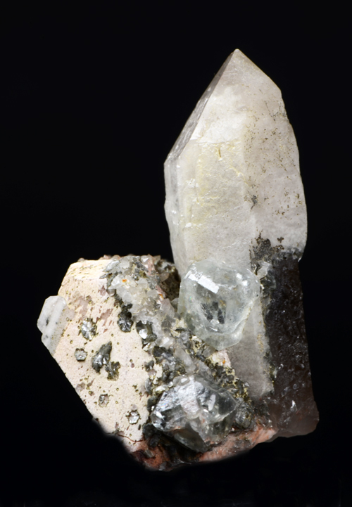 Classic combo from the ww known Baveno quarry, featuring a super waterclean cubic xl of pale blue Fluorite, aesthetically set among Orthoclase xls, and quartz! Excellent for the locale!