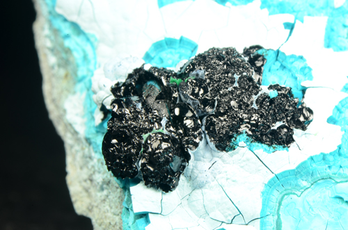 Specimen featuring an array of lustrous, black bubbly heterogenite botryoids. The crystals rest on a turquoise-blue and green Chrysocolla matrix creating a nice contrast.