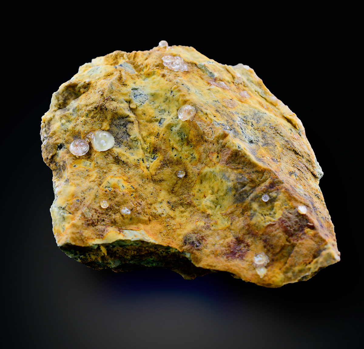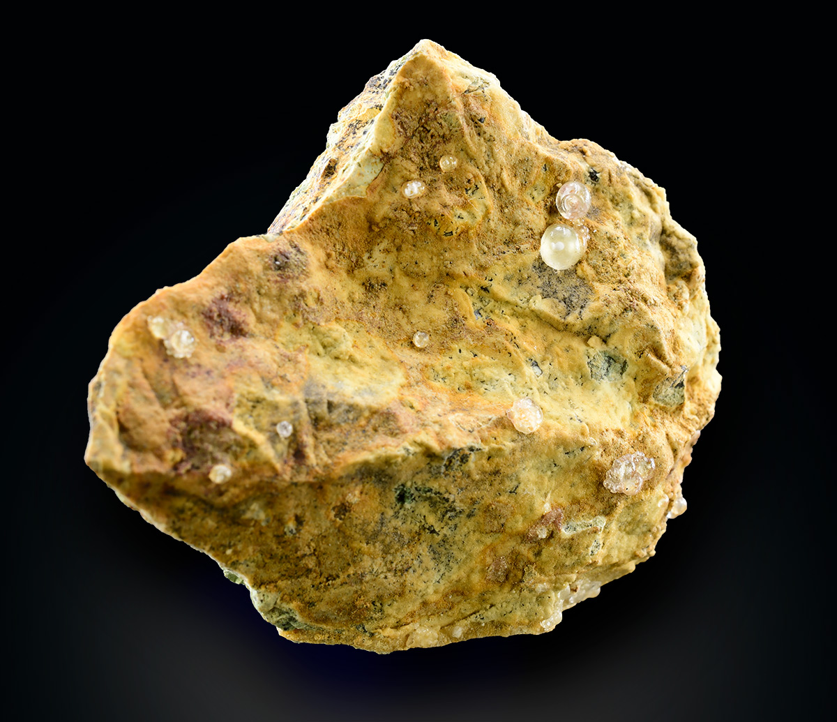 Nice Melanpphlogite's spherese up to 3,5 mm, partially transparent and gemmy, scattered on a Magnesite's crust on a altered ophiolitic breccia.