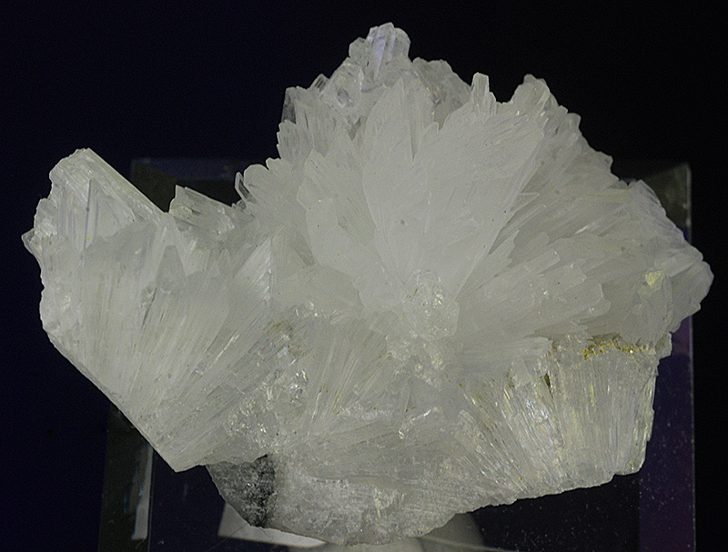 The olshanskyite is the unique new from Munich Mineralshow of this year. It's a rare borate and this is a miniature that is futuring long and perfected crystals that are scattering out from a crust of the same olshanskyite. It's a very difficult material to photograph because it's white without contrast: to show the details the pictures are a little underexposed and some of them are made with a polarizer filter. It's glued to the plastic bottom.